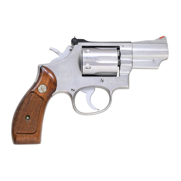 Cal. 357 Mag. S# 32K3884. Bbl. 2 1/2" pinned. Ramped serrated blade front sight with orange insert. Adjustable square notch rear sight. Stainless finish with hard chrome trigger & hammer. Checkered walnut grips with silver S&W medallions. UNATTACHED ACCESSORIES: factory box in fair condition that has been renumbered to match revolver with manual, paperwork, cleaning kit & screwdriver. CONDITION: grips show some oil staining & handling marks. Metal shows some handling marks, operational wear & scratches. Action functions properly when hand cycled. Bright near excellent bore. PROVENANCE: From the Lifelong Collection of George Staden S&W Member #3451. (25-179/MJC). MODERN. $500-800.