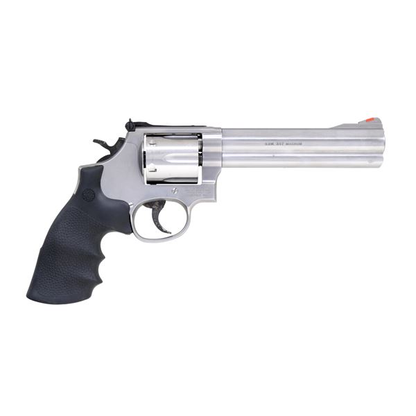 Cal. 357 Mag. S# CCP1096. Bbl. 6" with full underlug. Ramped serrated blade front sight with orange insert. Adjustable square notch rear sight with white outline. Stainless finish. Hogue black rubber Monogrip with finger grooves. UNATTACHED ACCESSORIES: factory hardcase that is numbered to a different revolver. CONDITION: grips show some handling marks. Hammer & trigger have a dark appearance with scattered oxidation staining. Balance of metal shows some operational wear & handling marks. Action functions properly when hand cycled. Bright near excellent bore. PROVENANCE: From the Lifelong Collection of George Staden S&W Member #3451. (25-183/MJC). MODERN. $400-600.