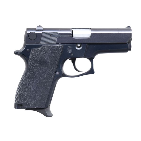 Cal. 9mm Luger. S# TAC1347. Bbl. 3 1/2". Ramped serrated blade front sight with yellow insert. Square notch rear sight with white outline. Right handed safety that also acts like a decocker. Black anodized aluminum frame & blued slide. Pebbled black grips with S&W monograms. MAGS: 2-12 rd. UNATTACHED ACCESSORIES: matching numbered factory box in fair condition with manual & paperwork. CONDITION: grips show minor handling wear. Metal retains 97% original finishes with some light edge & handling wear. Action functions properly when hand cycled. Bright near excellent bore. PROVENANCE: From the Lifelong Collection of George Staden S&W Member #3451. (25-148/MJC). MODERN. $250-350.