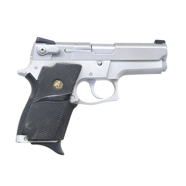 Cal. 9mm Luger. S# TAH7681. Bbl. 3 1/2". Serrated blade front sight with Novak's rear. Both sights have added white paint. Stainless finish with slide having a brighter appearance than frame. Pachmayr Signature Model grip. MAGS: 2-12 rd. CONDITION: grips show some dirt staining & handling wear. Metal rates very good with some handling marks & operational wear. Action functions properly when hand cycled. Bright near excellent bore. PROVENANCE: From the Lifelong Collection of George Staden S&W Member #3451. (25-181/MJC). MODERN. $350-550.