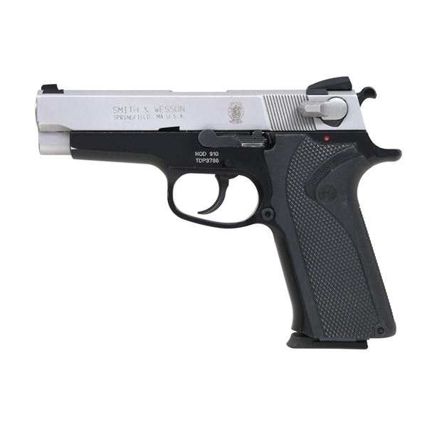 Cal. 9mm Luger. S# TDP3786. Bbl. 4". Three dot sights. "Value series" semi auto pistol made from the 1990's until early 2000's. Stainless bbl. & slide. Black anodized frame. Checkered black grips with S&W logos. MAGS: 1-15 rd. unmarked. CONDITION: grips show some handling marks & light wear. Bbl. & slide show some edge wear, operational wear & a couple tiny spots of oxidation staining. Frame retains 97% black anodizing with some edge wear. Action functions properly when hand cycled. Bright near excellent bore. PROVENANCE: From the Lifelong Collection of George Staden S&W Member #3451. (25-186/MJC). MODERN. $200-300.