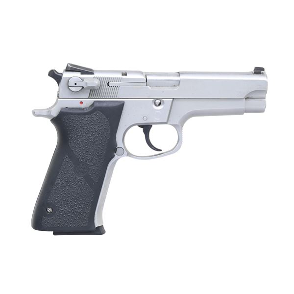 Cal. 9mm Luger. S# VYW9936. Bbl. 4". Three dot sights with Novak rear. Right handed safety also acts as a decocker. Stainless finish. Black Hogue grip. MAGS: 2-15 rd. One mag is of Ram-Line mfr. & other S&W. CONDITION: grips show light handling wear & marks. Metal appears lightly cleaned with a brighter appearance with some dings, handling marks & light scratches. Action functions properly when hand cycled. Bright near excellent bore. PROVENANCE: From the Lifelong Collection of George Staden S&W Member #3451. (25-167/MJC). MODERN. $300-500.