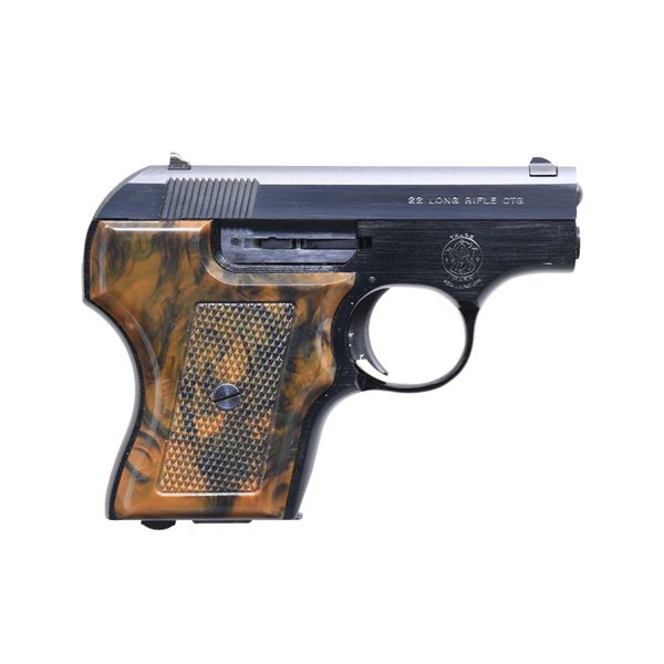 Cal. 22 LR. S# B57520. Bbl. 2". Blade front sight. Square notch rear sight. Mfg. 1973. Blued finish. Two-piece brown grips. MAGS: 1-5 rd. UNATTACHED ACCESSORIES: matching numbered factory box with factory softcase, manual & cleaning kit. CONDITION: all aspects near excellent. PROVENANCE: From the Lifelong Collection of George Staden S&W Member #3451. (25-169/MJC). CURIO. $300-400.