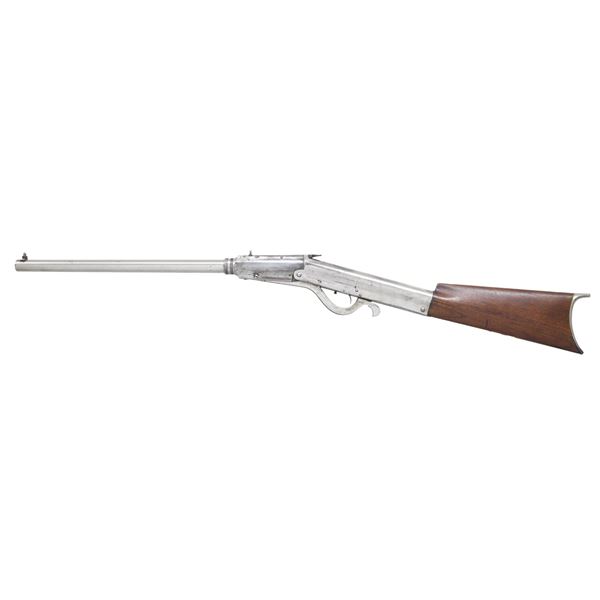 Cal. .21 / 22 RF. S# 834. Version #2 mfg. before 1892 when the company marked a 1887 patent date for a interchangeable firing pin allowing the air gun to shoot 22 rimfire ammo. Rifled 17 7/8" barrel. Blade front sight & V notch front sight. Nickel finish. Walnut buttstock with crescent buttplate. All visible numbers match. UNATTACHED ACCESSORIES: interchangeable firing pin in patchbox. CONDITION: Fair nickel showing peeling to gray/brown patina; portion of barrel shows cleaning. Buttstock has good finish with large cracks on both sides of wrist. Bore shows strong rifling & shine. (01-26234/MD). ANTIQUE. $200-400.