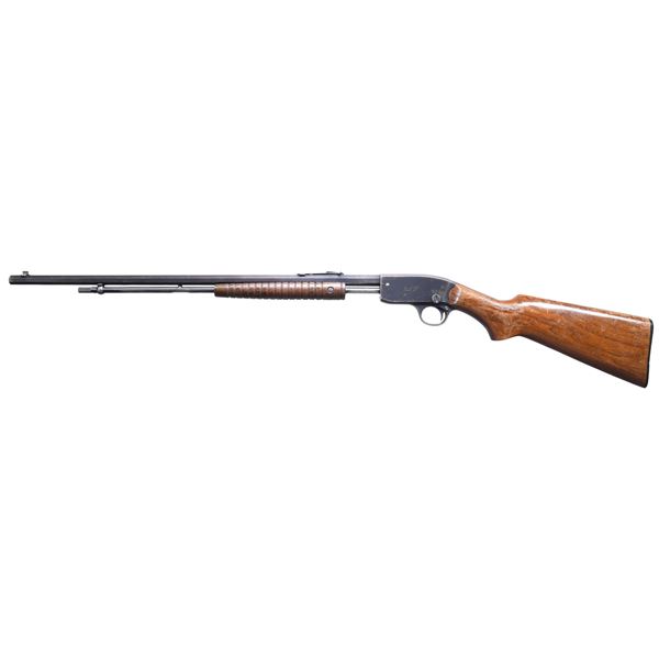 Cal. 22 S, L, LR. S# 112972. Oct. 24" barrel. Bead front & elevator rear sights. Tubular mag. Grooved walnut forearm & pistol grip stock w/ grooved hard rubber buttplate. CONDITION: fair dull fading blue on barrel & receiver mixing with streak of brown patina shows areas of worn finish & scattered light marks. Fair wood finish peeling & marks throughout with considerable wear in carry areas. Shiny bore with strong rifling & light pitting around muzzle. (25-677/MD). CURIO. $300-450.