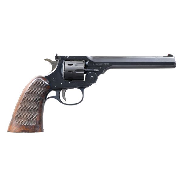 Cal. 22 LR. S# S18755. Appears to be 4th Variation. Interior of frame electro-pencil marked "W / O / W". Barrel 6". Top break action with matching numbered 9 shot cyl. & automatic extractor. Blade front & square notch rear sights. Walnut checkered grip. UNATTACHED ACCESSORIES: Brauer Bros brown leather holster. CONDITION: Very good blue on barrel & frame with worn finish at bottom of front strap & reblued cylinder. Good grip with some gouges. Shiny bore with strong rifling. (24-6967/MD). CURIO. $200-300.