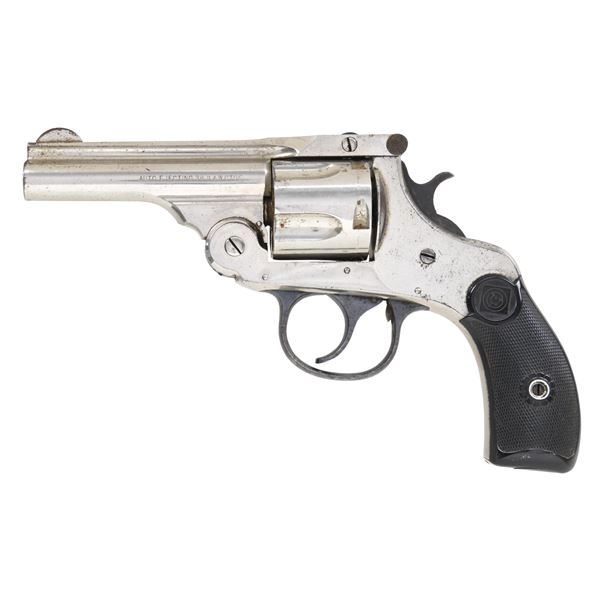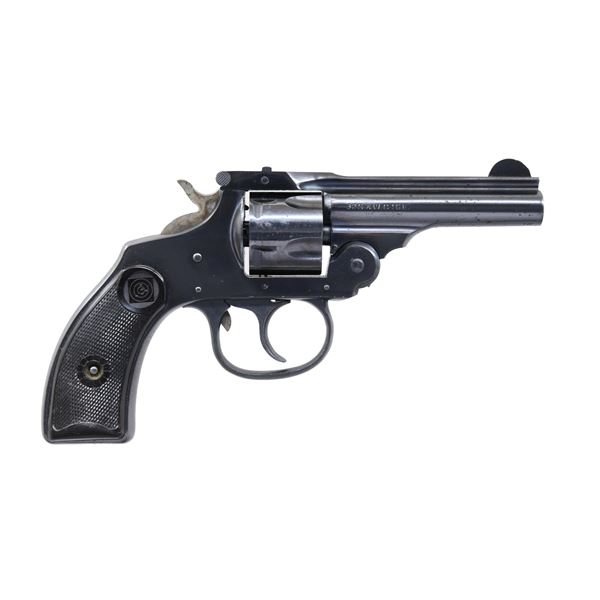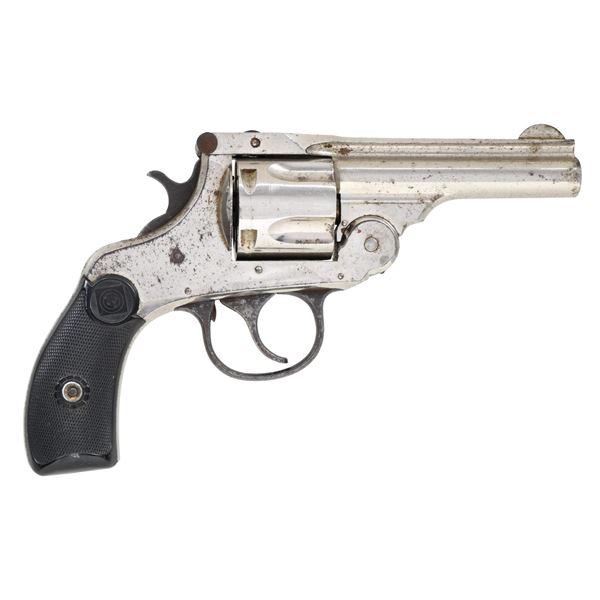 1) H&R AUTO-EJECTING TOP-BREAK DA REVOLVER. Cal. 38 S&W. S# 174510. Bbl. 3 ¼”. Round blade front sight. U-notch rear sight. Nickel finish with blued trigger guard, case colored trigger & hammer. Checkered black grips with target monograms. CONDITION: grips show a couple cracks on bottom, some dirt staining & handling wear. Metal shows scattered flaking & oxidation. Revolver appears to have a timing issue with cyl. Spinning a bit when hammer is cocked. Poor bore. (24-7176/MJC).