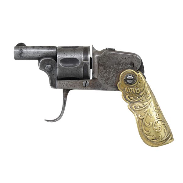 ACTION REVOLVER. Cal. 6.35mm. NSN. Bbl. 1 1/4". Folding grip and trigger, double-action revolver, mfg. in Belgium by D.D. Oury. Left side of the frame is marked "D.D. OURY/ BTE". Right side of the frame, bbl., as well as the rear face of the cyl., exhibit Belgian commercial proofs. Frame is mounted with a 1-piece "NOVO" stamped brass folding grip, which is embellished with scrollwork on a textured background. Half-moon blade front sight, with diminutive notch rear sight. CONDITION: Metal components retain a mottled gray patina, with scattered spots of light to mild pitting present overall. Bright bore, exhibiting some scattered spots of oxidation, while retaining well-defined rifling throughout. Brass grip exhibits a mellow patina. (24-6981/MLW). CURIO. $200-400.