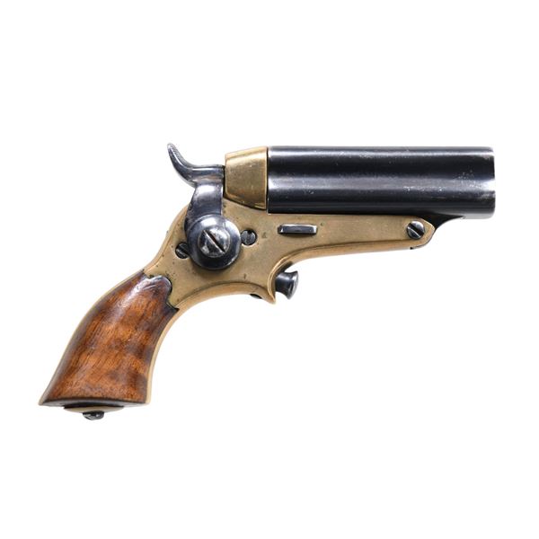 Cal. 32 RF. S# J13. Mfg. late 1860's. Four shot 2 3/4" cluster. Brass frame with wedge to retain barrels. Circular push button trigger. Two piece walnut grips. CONDITION: barrels, hammer & trigger reblued over prior pitting with wear. Brass heavily cleaned of markings with marks. Good grips. Pitted bores. Gunsmith attention needed; unable to cycle firing pin or pull trigger to drop hammer. (01-26522/MD). ANTIQUE. $250-500.