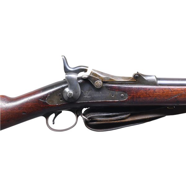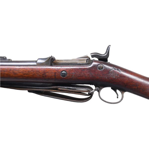 SINGLE SHOT MILITARY RIFLE. Cal. 45-70. S# 542813. Bbl. 32 1/2". S# indicates receiver made in 1892. Stock cartouche above trigger guard is boxed "SWP / 1892". Low arch breech block correctly marked "U.S. / MODEL / 1884". Bbl. has the "VP / eagle head" proof. Buffington rear sight marked "R" graduated to 2,000 yards. Blade front sight. Flat lockplate marked w/ eagle & "US SPRINGFIELD". Rod bayonet is present. One piece trigger guard. Walnut stock is equipped w/ trap buttplate. Besides the acceptance mark, additional markings include encircled script "P" proof under grip. Marked on left side of butt in red "246" rack number. Correct original single hook sling. Sling marked w/ "US" & is constructed from two piece of leather w/ stitched lap seam. CONDITION: stock has crisp markings & good appearance, however, it has numerous handling marks including light wear to be expected from long service. Notable dent in wrist above acceptance mark. Metal retains a good portion of its original blue w/ thinning light wear. Breech block & breech screw retain a large portion of case colors. Very good shiny bore w/ sharp lands. Sling has wear, scuffing & flexing. (01-26359/RW). ANTIQUE. $1,500-2,000.
