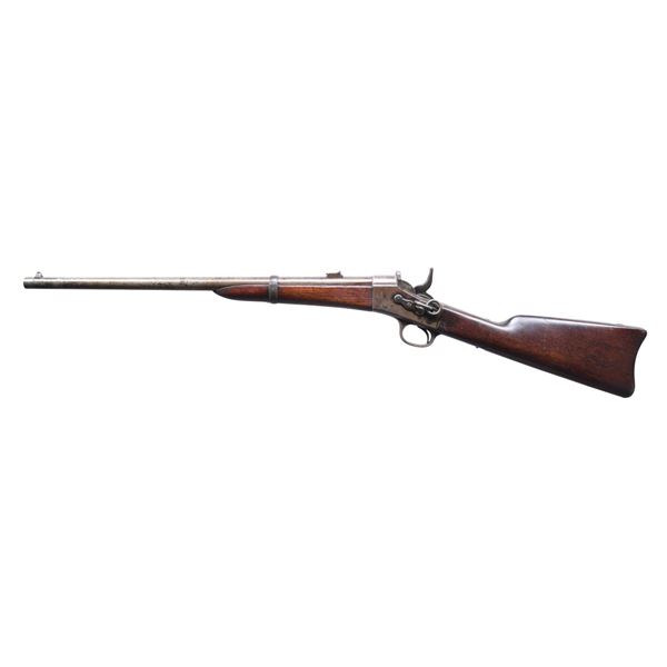MILITARY SADDLE RING CARBINE. Cal. 50-70. NSN. Bbl. 22". These rifles were ordered w/ the unique locking action which acts as a safety to prevent the hammer falling until the breechblock is securely closed. The hammer must then be brought to full cock before firing. Folding leaf rear sight. Inverted V front sight. Action is fitted w/ a rotary type extractor & has a saddle ring on the left side. Receiver ring is marked on top w/ patent dates, the latest being 1871. Walnut stock set. Forend has single band retained by a spring at the bottom. Buttstock has illegible acceptance mark on the left side of the grip. CONDITION: stock set has a worn original finish w/ scattered handling marks throughout. Metal is turning gray & patina w/ spots of light oxidation. Bore has strong sharp lands & a degree of shine, but also has frosting & scattered light pitting. (01-26338/RW). ANTIQUE. $300-500.