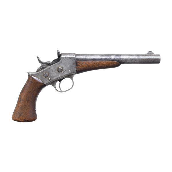 Cal. 50 CF. S# 2706 (under grip). Mfg. 1872-1888 with approx. 6,000 produced. Round 8" barrel. Case colored receiver with Remington patent dates on left side. Walnut stock set with partially discernable "CRS" cartouche on left side of grip. CONDITION: Barrel has gray/brown patina appearance with blue hidden by forearm; marks, light pitting & patina throughout. Gray/brown receiver showing little case colors with numerous marks & patina. Fair worn finish on wood with partially discernable cartouche, small gouges & marks. Fair bore with pitting & strong rifling. (01-26354/MD). ANTIQUE. $400-600.