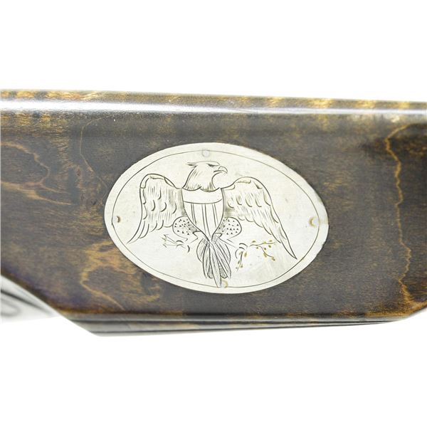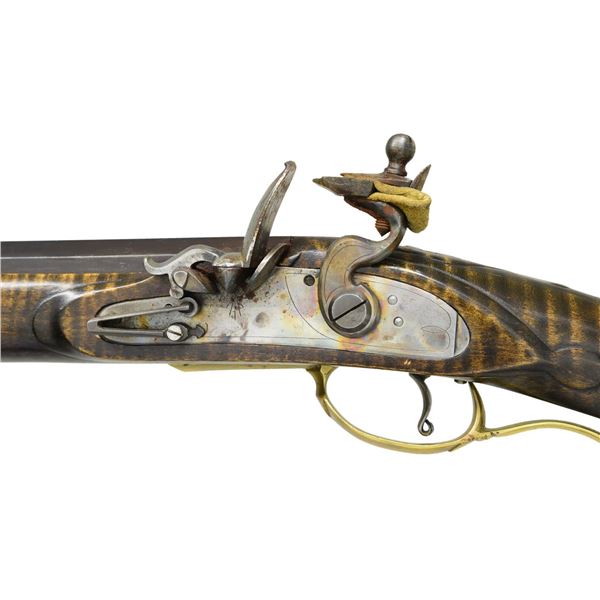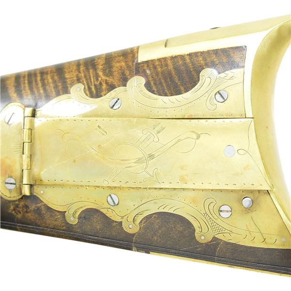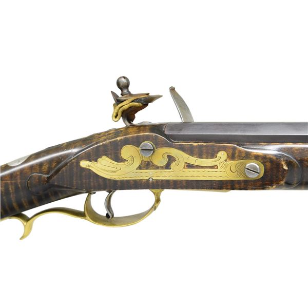 -HAND FLINTLOCK RIFLE BY DON GOUCHER, ca. 1980. Cal. 45. NSN. Bbl. Rifled 42 1/2" oct. w/ sculpted transition to multifaceted front section. Top flat has maker's name "Don Goucher". Rocky Mountain style German silver blade front sight w/ U notch rear sight. Heat colored left hand lock & hammer. Plain trigger. Full length pin fastened cheekpiece stock of fancy curly Maple. Left side of stock has a pierced segmented rectangular daisy finial patch box w/ hand engraving featuring a bow w/ quiver of arrows on lid. Other brass fittings include crescent buttplate, engraved toe plate, finger curl trigger guard, pierced & engraved side plate, faceted thimble & 2 oct. pipes. Has engraved eagle in German silver on cheekpiece & circular wrist plate marked "N". Well-executed relief carved scrollwork around cheekpiece w/ relief contours around comb, lock & thimble area and incised carving along toeline. Ramrod channel has a mullered border. Brass tipped hardwood ramrod. CONDITION: excellent. Browned bbl finish showing light edge wear. Lock, frizzen, hammer & breech area show some light surface corrosion from use. Brass parts are acquiring a pleasing mild patina. Good original stock finish showing scattered handling marks. Bore retains deep sharp rifling. PROVENANCE: Estate of Rick Ingwersen. (01-20150/DS). ANTIQUE. $800-1,200.
