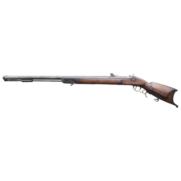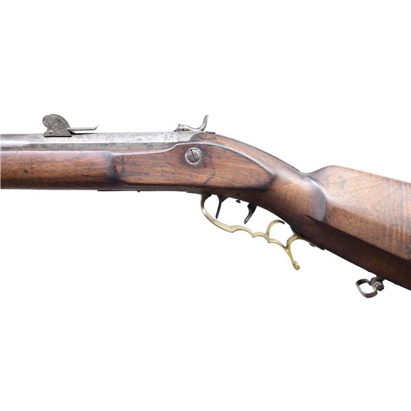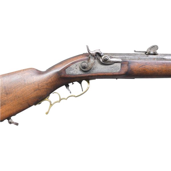 SHARPSHOOTERS RIFLE. Cal. 66. S# 1760. Bbl. 35 3/8". Swiss percussion musket subsequently converted to a Cantonal Sharpshooters rifle for the Luzern Canton. The faceted breech is marked "84" over the top flat, with "K (Luzern Canton shield insignia) L" above an encircled "Z" proof on the left quarter flat, as well as "1760" and a Belgian sole proof on the left flat. Model 1842 pattern lockplate is unmarked. Plain wood half-stock appears to have been sanded and reoiled at one time, and features a cheek rest, Schuetzen style buttplate, Schuetzen style trigger guard, and sling loops. Double set triggers. Blade front sight, with U-notch rear sight graduated "2", "4", "6", and "8". Underside of bbl. features a single ramrod ferrule, with a bayonet socket mounted on the right at the muzzle. CONDITION: metal components retain a gray patina, exhibiting scattered areas of darker age related discoloration, with varying degrees of pitting present overall. Brass trigger guard exhibits a mellow patina. Good bore, exhibiting dark pitting in the grooves, while retaining strong rifling throughout. Action and double set triggers function appropriately when cycled by hand. Stock shows some superficial marks from handling and storage, but otherwise remains sturdy and serviceable. (01-26196/MLW). ANTIQUE. $500-800.