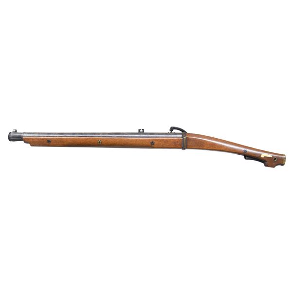 CARBINE. Cal. 70. NSN. Cannonade 23 1/2" barrel. Tall barleycorn style front sight & tall notch rear sight. Barrel has generous coverage of engraving & silver appearing highlights of dragons & clouds. Hardwood stock with cherry blossom ornamentation, eyelet hole near buttplate. CONDITION: Metal has dark patina appearance. Wood has good finish with marks; large long crack extending from forearm. Dark pitted bore. Missing ramrod Hammer unable to hold at full cock. (01-26459/MD). ANTIQUE. $500-1,000.