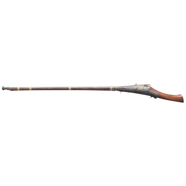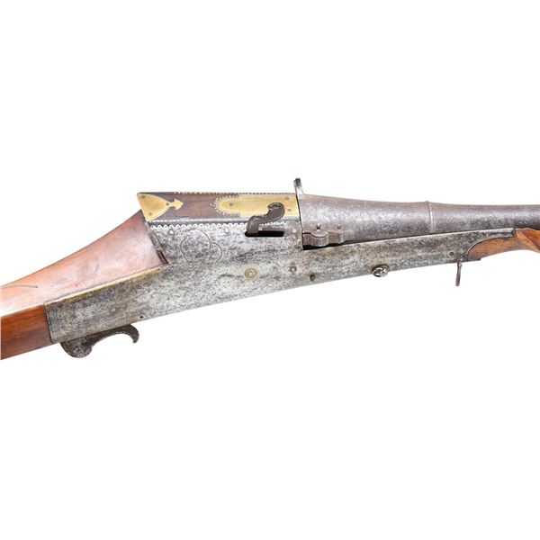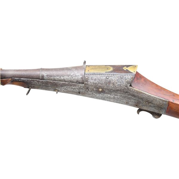 Cal. 60. NSN. Barrel 48" with faceted cannonade muzzle. Enlarged breech section approx. 3" in diameter with sliding touch hole cover & tall notch rear sight. Hardwood stock has 4 sections of newly wrapped brass wire bands, iron plates on sides with brass plates on top. Lever operated trigger. Swept curved butt section. CONDITION: barrel shows dark brown patina with pitting. Action areas of gray patina appearance with light engraving. Brass shows light patina. Wood shows marks throughout; forearm has 23" split along bottom held by brass wire. Pitted dark bore. (01-26198/MD). ANTIQUE. $500-800.