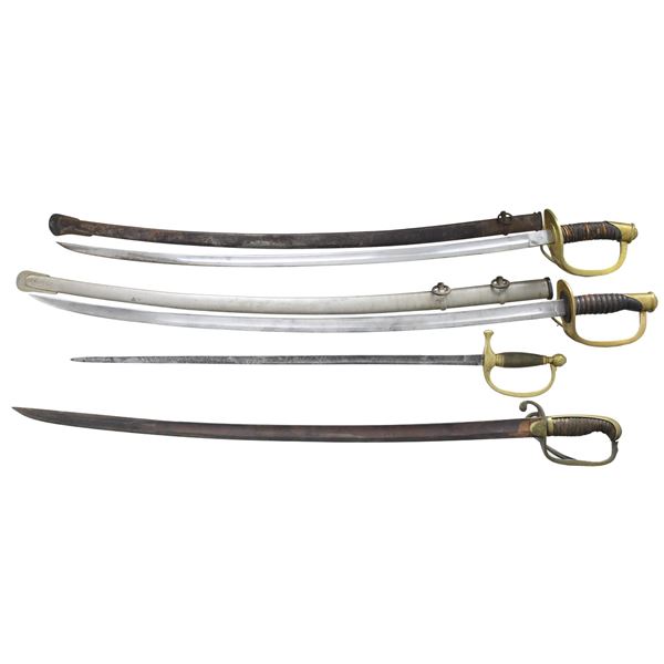 1) M1860. Overall length: 39 1/2". Blade length: 33". An import cavalry saber featuring a plain blade with a single wide fuller and a secondary fuller near the spine. The ricasso is stamped "(squirrels) R&B" and "(liberty cap) LIBERTAD R.M.". Brass hilt with a 2-branch semi-basket guard. The underside of the guard is stamped "GEN. KEO. 14.". Wire wrapped leather grip. Iron scabbard. CONDITION: blade has a clean finish with some staining near the tip, and the blade does show evidence of sharpening. Hilt shows light wear. Grip leather is about 60% but the wire is complete. Scabbard has a dark finish with some oxidation and a few shallow dents. 2) M1840. Overall length: 33 1/2". Blade length: 27 3/4". An enlisted musician's sword with a plain blade featuring a single medium fuller. The blade is stamped "N.J" on the ricasso, indicating issuance by the state of New Jersey. Solid brass hilt with simulated wire wrapped grip. No scabbard. CONDITION: blade has a medium gray mottled patina. Hilt has a pleasing light mustard patina. 3) M1860. Overall length: 42 1/2". Blade length: 34 5/8". A cavalry saber with a plain blade featuring a single large fuller and a secondary fuller near the spine. The ricasso has a worn mark that is obviously for Emerson & Silver. The other side is marked "U.S." and "1864". Brass hilt with a 2-branch semi-basket guard. Wire wrapped leather grip. This sword has a incorrect, but original, M1906 scabbard. CONDITION: blade has a light gray finish with light spotty staining. Hilt shows light wear. Grip is complete but shows wear and wire is 100%. Scabbard shows light oxidation towards the top. 4) MILITIA. Overall length: 39". Blade length: 33 1/2". A militia style artillery saber featuring an engraved blade that has a single wide fuller. The engraving appears to include various foliate motifs and sprays of arms. Brass hilt with a 2-branch semi-basket guard and a sharply downturned pendulous quillon. Wire wrapped leather grip. No scabbard. CONDITION: blade has a dark gray patina, is a bit bent, and its engraving is somewhat obscured. Hilt is quite solid but is slightly misshaped. Grip is about 60% but the wire appears complete though dislodged. (02-23828/BF). $700-1,000.