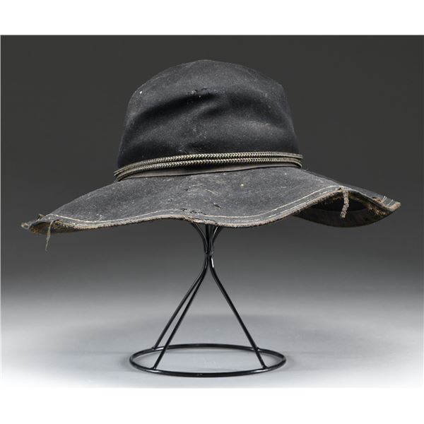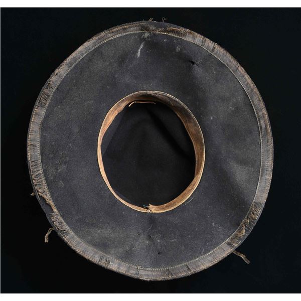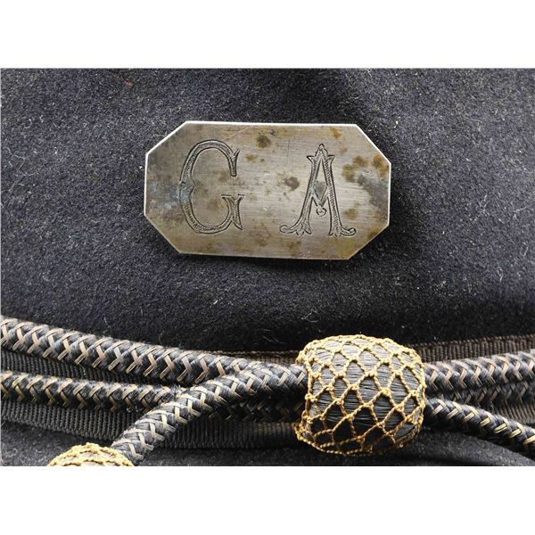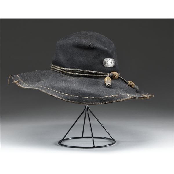 A fine black wool felt slouch hat, likely dating to the 1880s or 1890s during the ascendancy of the UCV organization. The slouch hat is of classic form, with a double-sewn brim that features black edging material. There is a grosgrain-type hat band covered by a fine Civil War period officer's hat cord of silver and gold bullion. One of the most interesting features of this hat is a silver octagonal rectangle on the front with the initials "G A" engraved upon it. The diameter of the brim is nearly 16" and is reinforced from beneath with a double-sewn 5/8" band. The brown leather sweatband measures about 1 1/2" in height. CONDITION: there is significant wear to the edge binding, and some of the stitching shows wear. The hat band and hat cord generally show light wear, and the silver front plate shows significant tarnish. The body of the hat has one small stitch repair and a few small holes, likely due to insect damage. The sweatband is complete but has darkened with sweat stains. (02-23607/BF). $500-1,500.