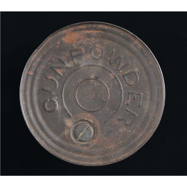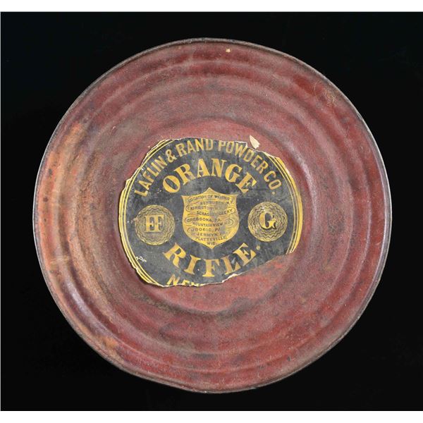 This keg measures approx. 11 5/8" in height and 9 1/2" in diameter. The base is embossed "GUN POWDER" with a non-ferrous screw-in plug. The keg is painted black with a central 3 1/2" red stripe and a red top. The top has a partial paper label that reads "LAFLIN & RAND POWDER CO. ORANGE FF G RIFLE." with a shield giving the location of several of the company's powder works. CONDITION: The painted finish has darkened with age but remains 80% intact. The paper label on the top is about 70% intact and is quite legible. There are a few non-offensive, minor dents throughout the keg. (02-23674/BF). $200-300.