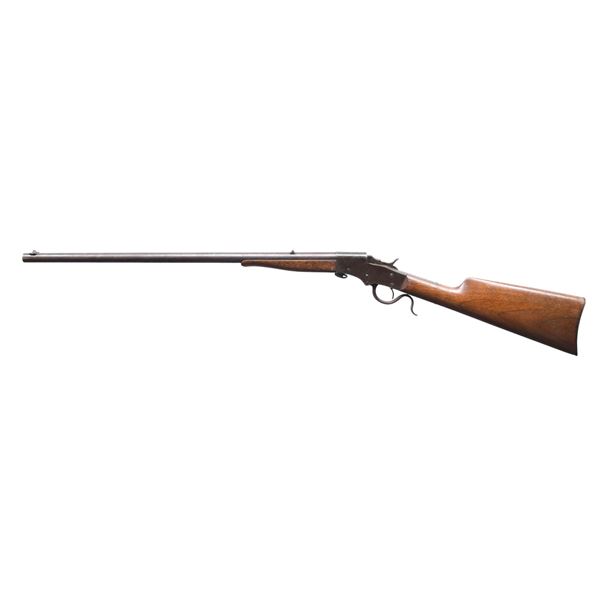 BLOCK RIFLE. Cal. 22 RF. S# 2224 (on frame hidden by forearm). Mfg. 1893-1894. Round 22" barrel. Blade front sight & V notch rear sight. Takedown action has removable side plate. Walnut stock set with curved steel buttplate. CONDITION: metal has traces of blue with balance gray/brown patina mixed with spots of corrosion. Fair wood finish with marks. Poor bore. (01-26834/MD). ANTIQUE. $100-200.