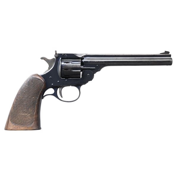 Cal. 22 LR. S# 2351. Appears to be 2nd Variation; cyl. marked "PATENT APPLIED FOR". Barrel 6". Top break action with matching numbered 9 shot cyl. & automatic extractor. Blade front & square notch rear sights. Walnut checkered grip. CONDITION: fair blue with areas of deep pitting on barrel & cylinder, worn finish on grip strap & scattered oxidation. Fair grip with deep marks & gouges. Good bore with strong rifling. (24-6973/MD). CURIO. $200-300.