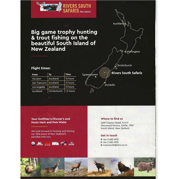 Mark and Pam Waite owners of River South Safaris have generously donated a four-day, five-night trophy red stag (320-360 SCI) hunt for one (1) hunter and one (1) observer. Your stay is in a private chalet with healthy, wholesome home-cooked New Zealand meals and beer and wine in moderation. You will receive an experienced, professional, and friendly NZ hunting guide and field preparation
