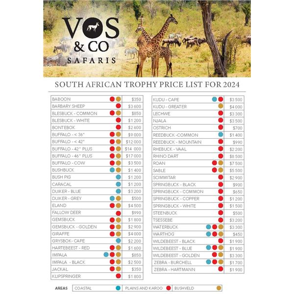 Excluded are before and after-hunt expenses, the day of arrival and departure of $350 per day per hunter, flights, airport transfer fee, firearms permit and clearance, taxidermy, and shipping of the trophies gratuities, 15% government VAT on the value of the package. No donated hunts may be taken back-to-back. If a client buys more than one (1) donated hunt, it must be taken in alternative years. No trophies will be refunded or swapped out. The donated hunt is only for two (2) hunters, as stated unless upgraded. Please contact the outfitter with any inquiries before buying the hunt.