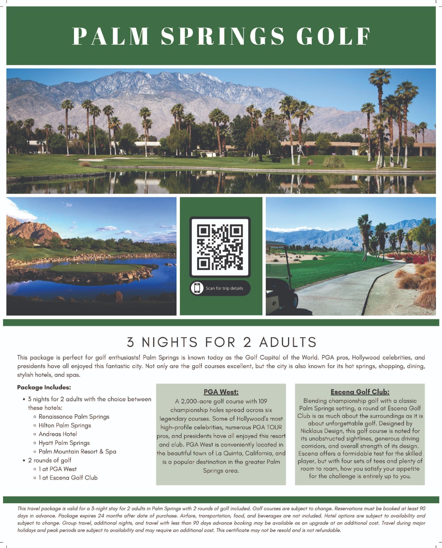 This travel package is valid for a 3-night stay for two (2) adults in Palm Springs with two (2) rounds of golf included. Golf courses are subject to change. Reservations must be booked at least 90 days in advance. The package expires 24 months after the date of purchase. Airfare, transportation, food, and beverages are not included. Hotel options are subject to availability and subject to change. Group travel, additional nights, and travel with less than 90 days advance booking may be available as an upgrade at an extra cost. Travel during major holidays and peak periods is subject to availability and may require an additional fee. This certificate may not be resold and is not refundable.