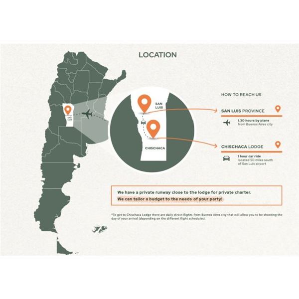 Enjoy a 5-night stay at Estancia Chischaca in a room (one queen or two double beds) and an en-suite Bathroom. Savor local-inspired gourmet meals, superb Argentine wine, and local beer in the main dining area. Then, relax in the living room and share stories about your successful day of hunting. A typical day begins with a full breakfast, a trip into the field to hunt, a relaxing lunch back at the lodge, a siesta, and another afternoon of big-game hunting. The day ends with cocktails, wine, appetizers, and dinner with courses inspired by the local Argentine culture, including fresh venison, chicken, beef, vegetables, and local desserts such as Crème caramel and Dulce de leche.
