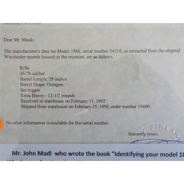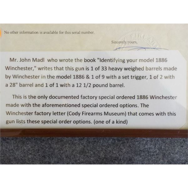 Winchester mod. 1886 45-70 cal. lever act. rifle w/ factory special order 28” extra heavy 12.5# octagon barrel & amp; set trigger (1892) #54318