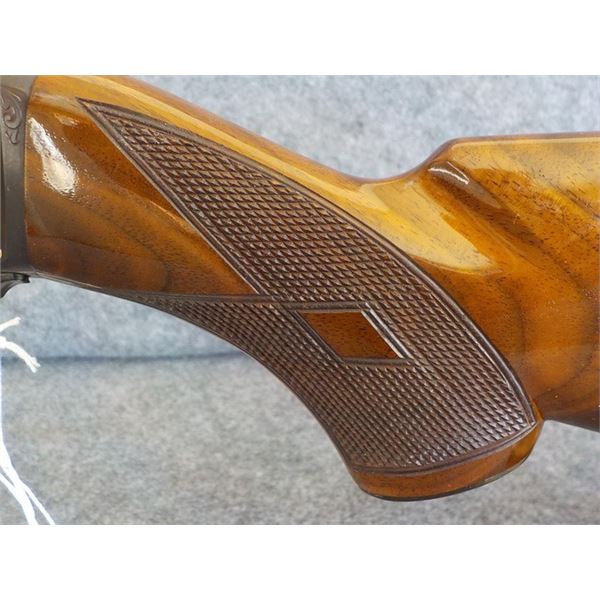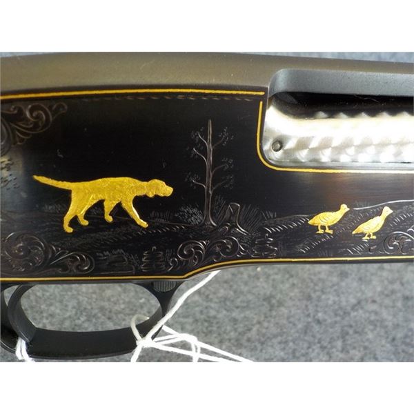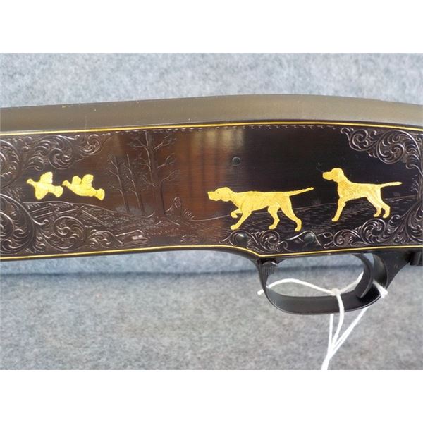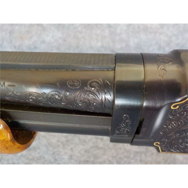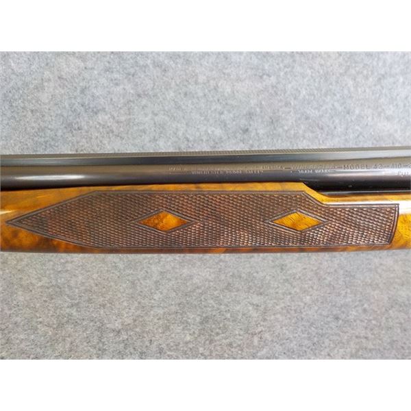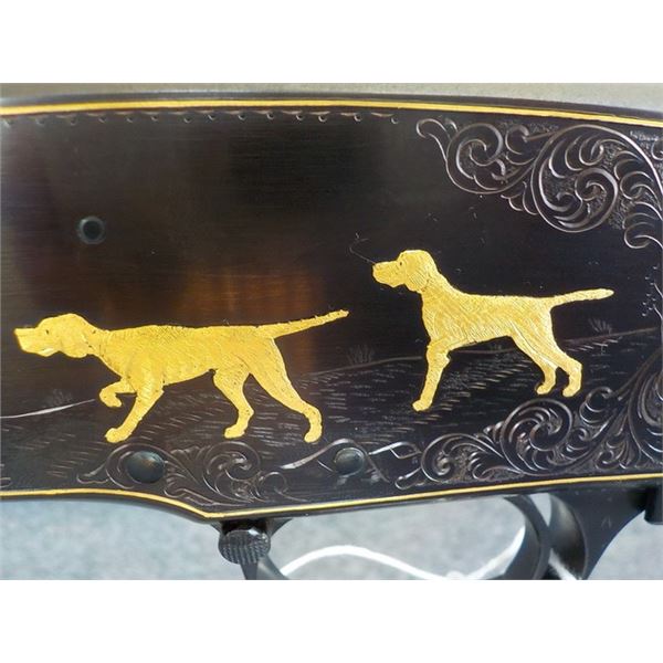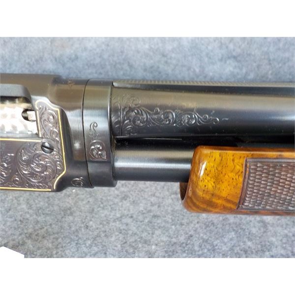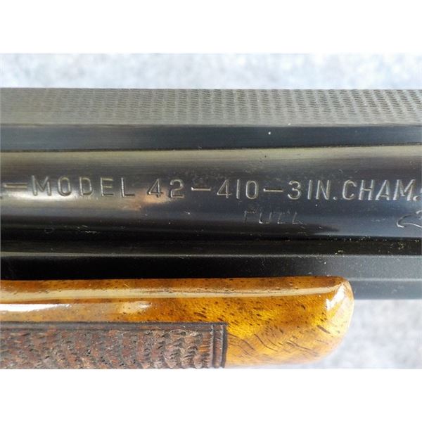 Winchester mod. 42 Pigeon Grade 410 bore 3” full choke pump shotgun w/ 26” barrel – scroll engraved w/ gold inlaid dog – grouse - & amp; quail – raised metal rib – deluxe grade wood – double diamond deluxe checkering – jeweled bolt & amp; carrier – Bradley red front sight – & amp; special order middle sight (1953) #99858
