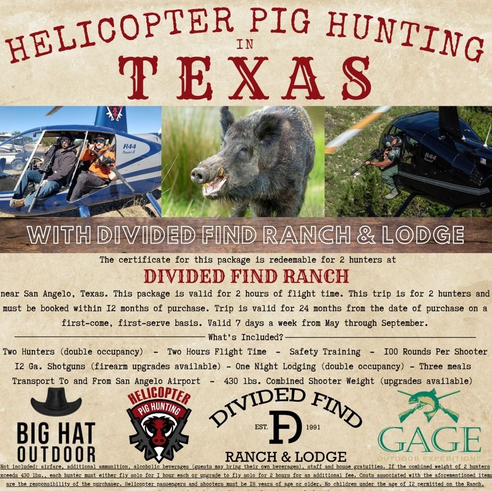 This package includes a two-hour helicopter hunt (double occupancy) for feral pigs at the Divided Find Ranch.