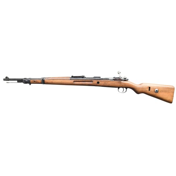 RIFLE. Cal. 8x57 (8mm Mauser). S# 5954f. Bbl. 23 1/2" with Mitchell's Mausers import marking. Blade front sight. Tangent rear sight graduated to 2000m. Matching original numbers on receiver, bbl., and front sight. Left side of butt, bolt parts, trigger guard, floorplate, and both bands renumbered to match likely by importer. Other parts are unnumbered or mismatched. Receiver top has "S/42G" marking denoting mfg. by Mauser Oberndorf in 1935. Bolt assembly, buttplate, and takedown disc are all polished to bright. Other parts have reblue finish that appears to be importer done. Banner K style stock with grasping grooves and left side sling provisions. Brightly finished cleaning rod is present. UNATTACHED ACCESSORIES: matching-numbered Mitchell's certificate and manual. CONDITION: refinished stock set shows an armorer-type patch repair and some chipping near the band keeper; the stock set otherwise shows some black staining and handling wear. Brightly finished parts show some light pitting and oxidation. Balance of metal retains 95-97% reblue with some light edge and handling wear. Action functions properly when hand-cycled. Good, bright bore, with some scattered light pitting but strong rifling. (24-4741/MJC). CURIO. $500-800.