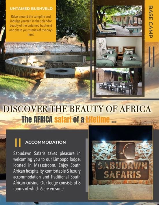 7 Day Package includes: This is an inclusive package with accommodation for 7 nights for 4 people at the lodge in the Limpopo province of South Africa, the lodge is 4 hours’ drive from Johannesburg International airport. The lodge consists of 4 luxurious rooms, each with an en-suite bathroom, the lodge also consists of a barbeque area, dining area and bar. Dinners and breakfast will be served in the dining area where you can taste traditional South African dishes. The hunting area that surrounds this lodge is 13,000 acres and there are numerous hunting concessions in the area that exceeds 140,000 acres of hunting land.
