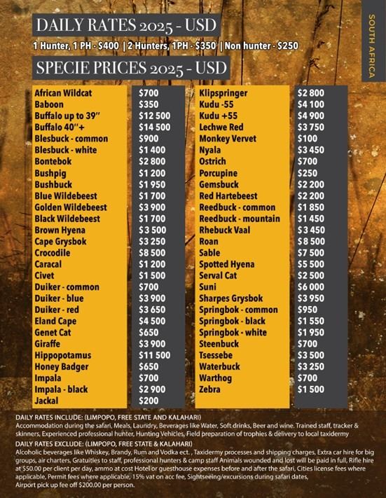 Not included: All travel and lodging before and after hunt. Gratuities. Additional species.