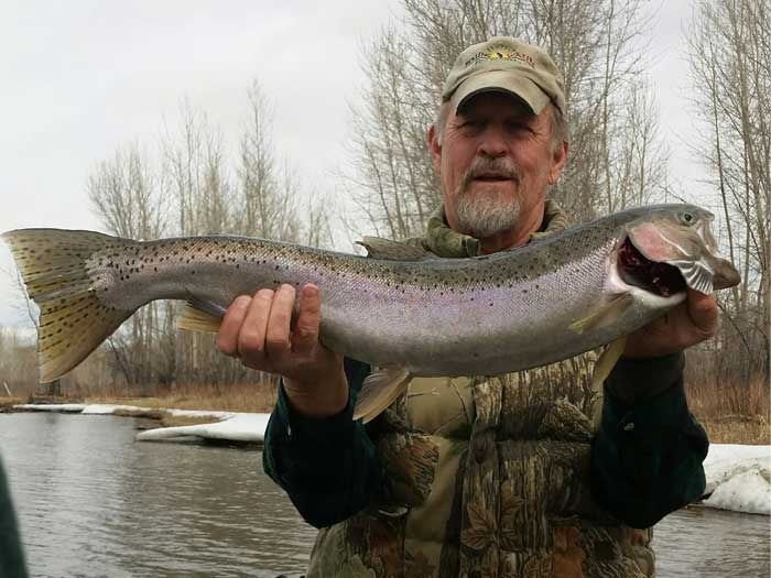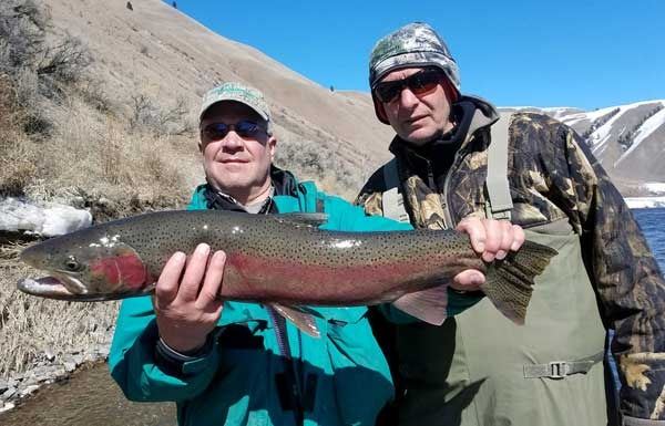 The spring season for steelhead is typically the month of March and first two weeks of April. Our weather and snow conditions are a huge factor in our spring run. When we experience high winter snow levels muddy water conditions can have a negative effect. There are times when we have a mild winter that the river is even fishable in February! Spring offers an exciting steelhead run. Large steelhead arrive here on the upper Salmon River, usually between Salmon and Challis areas, finishing their spawn run. Good water clarity with a small amount of low snow run off can make it possible for successful steelhead fishing. Fly fishing for steelhead in the spring is great as well, as these fish stack up on the gravel bars and channels.