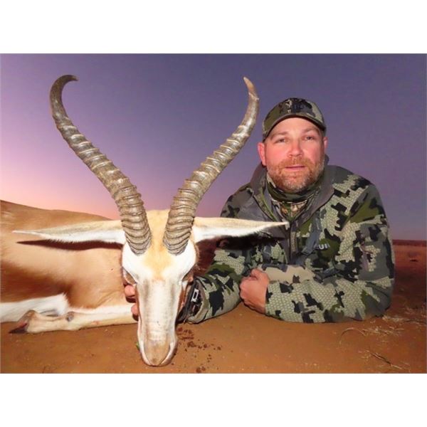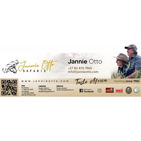 Experience an unforgettable adventure with 4-days of plains game hunting for one hunter and one non-hunter in central South Africa, followed by a 4-day retreat to the breathtaking Victoria Falls in Zimbabwe. Your Victoria Falls retreat features shared accommodation and breakfast at a riverside lodge along the Zambezi, plus a magical sunset cruise with Jannie Otto Safaris. The package includes round-trip international flights from Johannesburg to Victoria Falls/Livingstone, hotel transfers, and breakfast. The hunting package covers the trophy fee for one Blue or Black Wildebeest and one common Springbuck, along with day fees for both the hunter and non-hunter. You'll enjoy full-service amenities at the hunting lodge, including staff, skinner, tracker, and professional hunter assistance. All meals, accommodation during the hunt, field preparation of trophies, and delivery to a taxidermist are also included. Please allow additional days for travel. Additional hunters/non-hunters are welcome for $650/hunter/day and $275/non-hunter/day. Hunt can also be upgraded to include extra nights, species. Not included: Firearm clearance at certain airports @ $35 per firearm each way, liquor, beer, wine and mixes at cost price plus 10%, 15% Value Added Government Tax (VAT) on value of package, hunting licenses in certain provinces @ $60 each, rifle hire @ $50 per rifle per day, ammo at cost, if needed, additional trophies as per 2025/2026 price list, flights and/or hotel accommodation before, during and after safari, taxidermy and shipping, transfer fee from nearest airport to hunting concession and return, $500 per vehicle (max 4 people). Schedule hunt for 2025 or 2026 with Jannie Otto Safaris, +27.83.470.7965, Email: info@jsnnieotto.com, Web; www.jannieotto.com Hunt cannot be combined with another Jannie Otto Safaris donation.