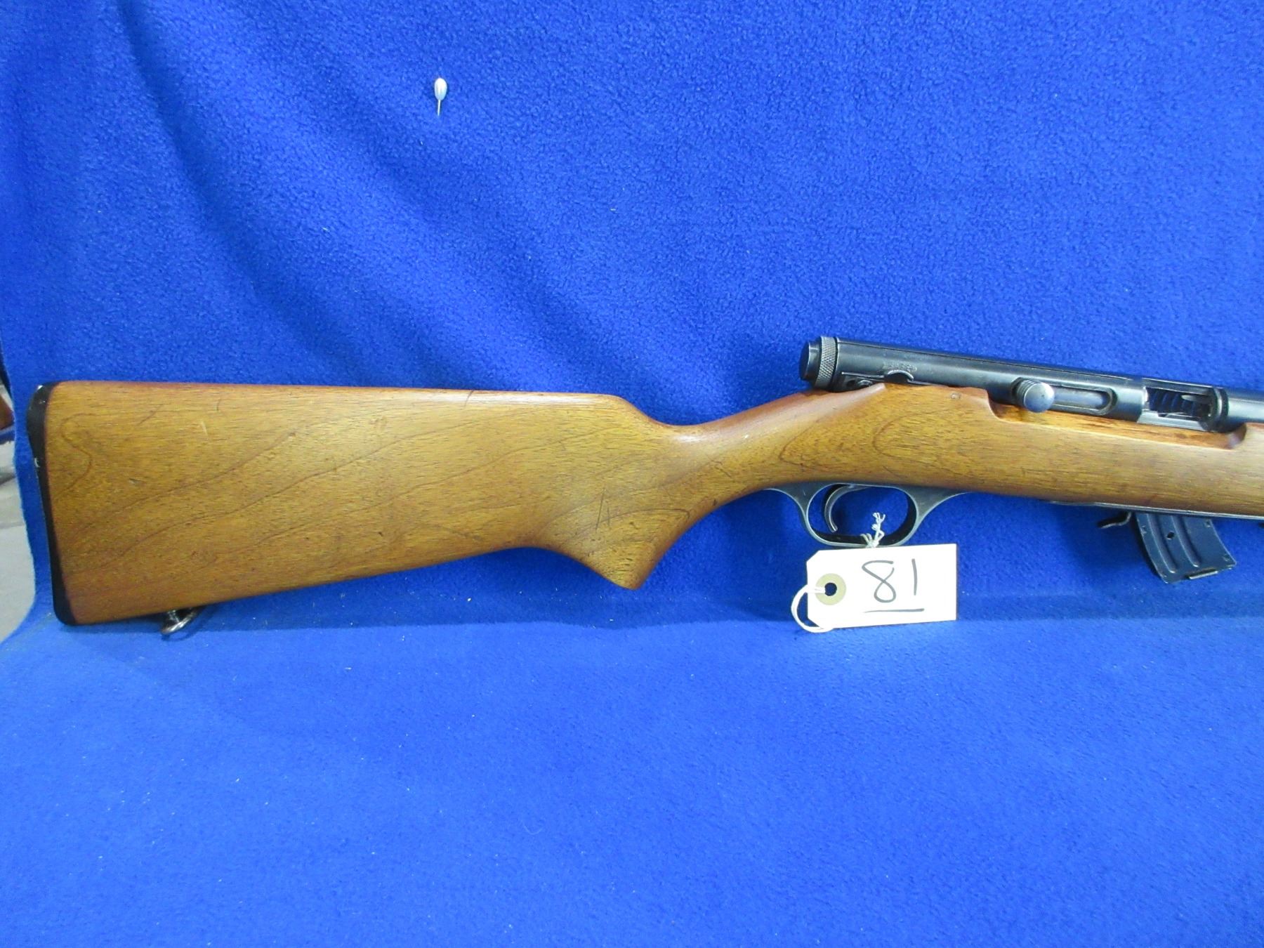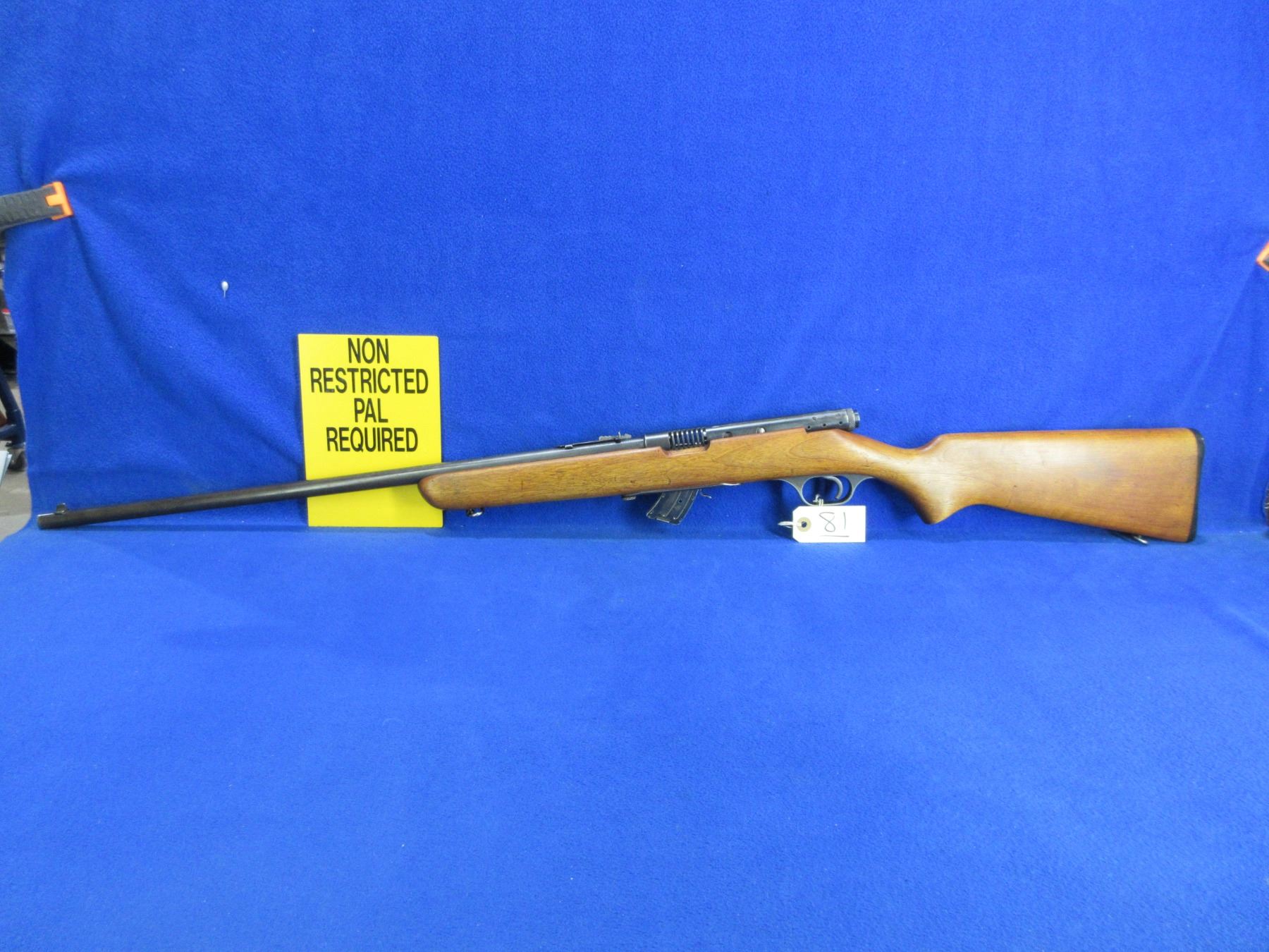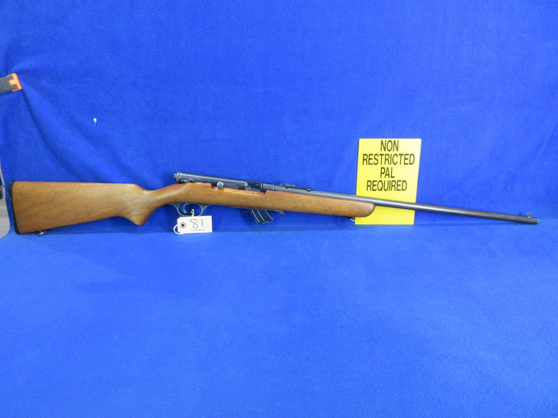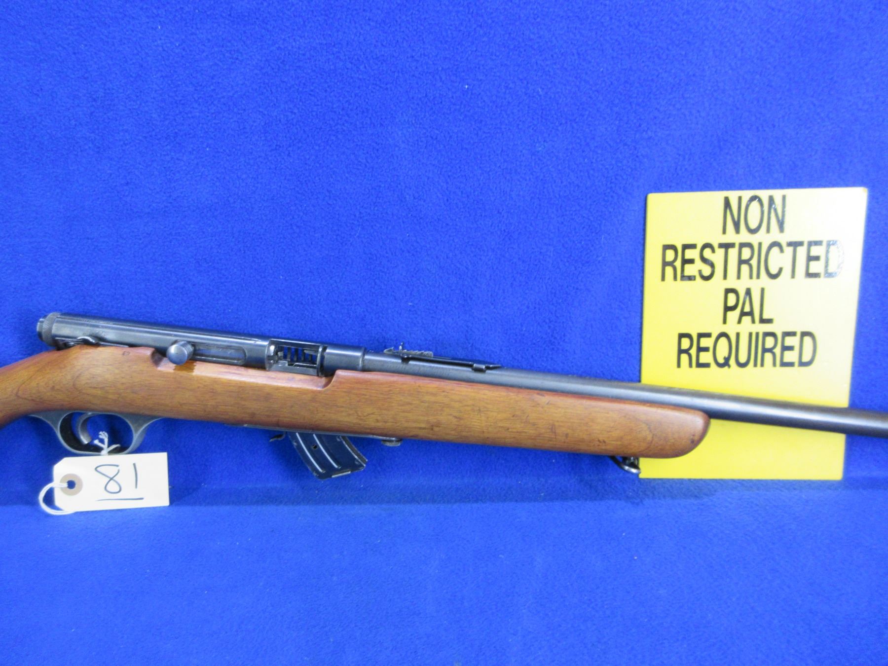 Non-Restricted - Stevens Model 85 in 22 S/L/LR (only LR is automatic)- This semi-auto rifle with removable magazine appears to be in good to very good working order. Barrel is 24" and has a few marks on the left side, rifling is good to very good, bluing is good but turning grey, has both sights, stock is good to very good with usage marks, butt plate good, comes with swivels. Ser # None