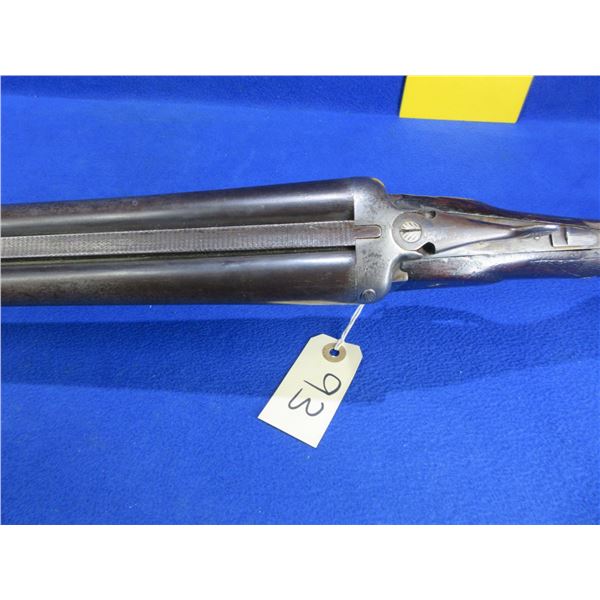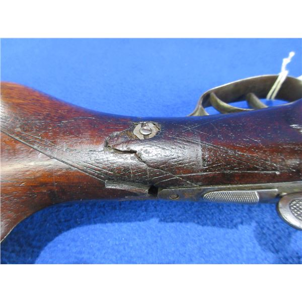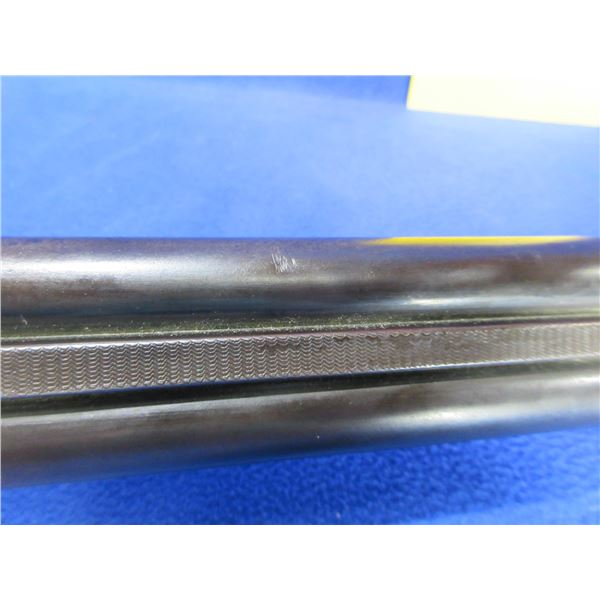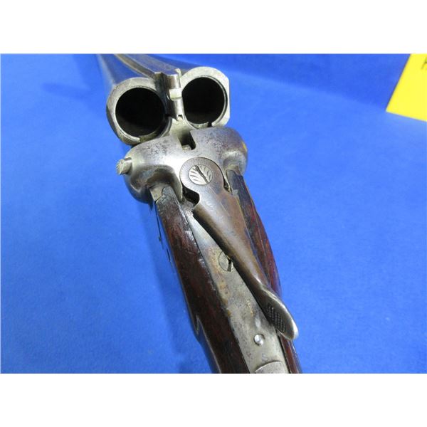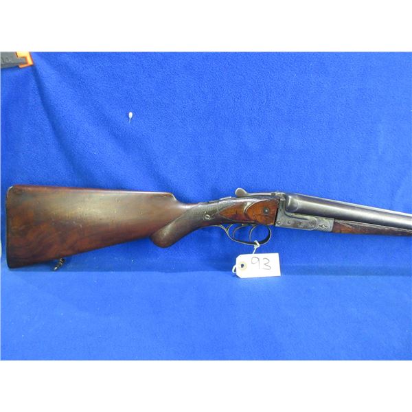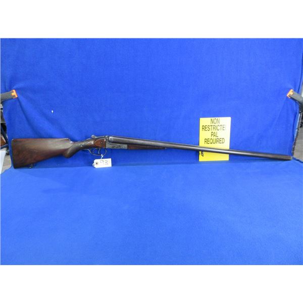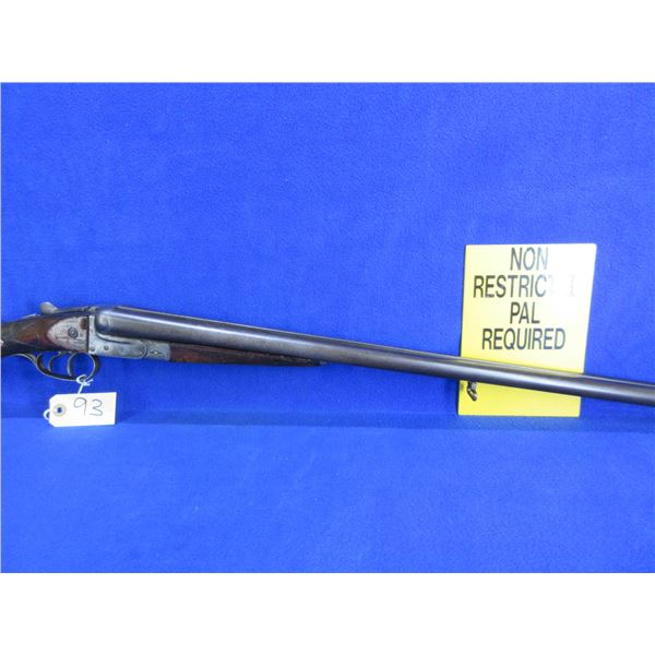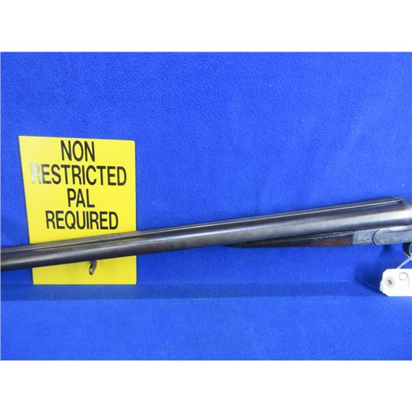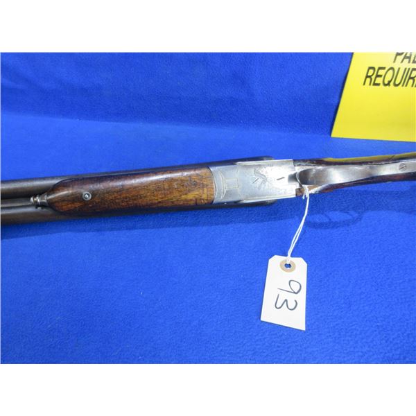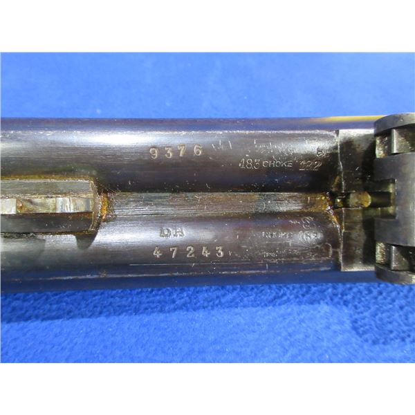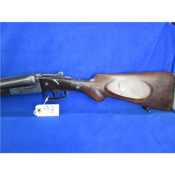 Non-Restricted - Belgian SxS in 12 Ga. 2 1/2" - This tip up SXS shotgun appears to be in working order but should not be fired as stock is broken and has a poor repair, action is tight. Barrels are 30" and has a dent on left barrel approx 16" from muzzle, bores are good, bluing is turning grey, has bead front sight, stock is broken and has been repaired with a bolt in the wrist area, forearm is good for age with usage marks, butt plate poor, comes with swivels. Ser # 47243