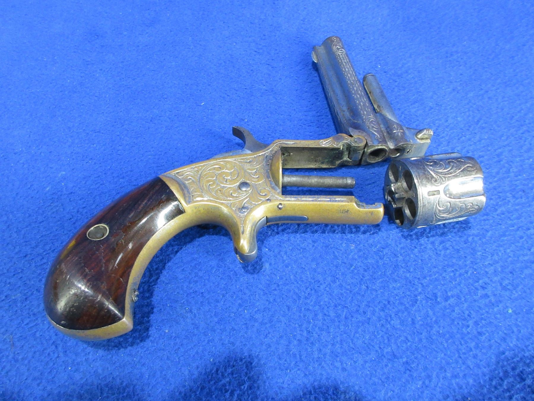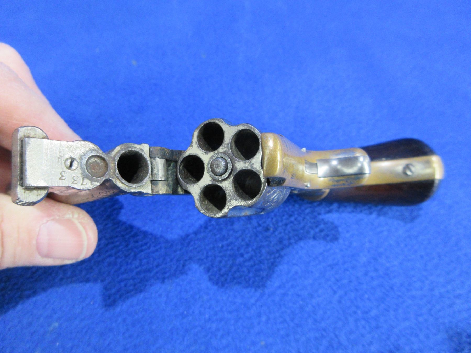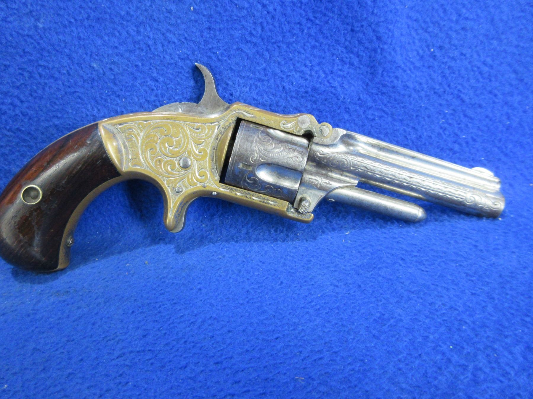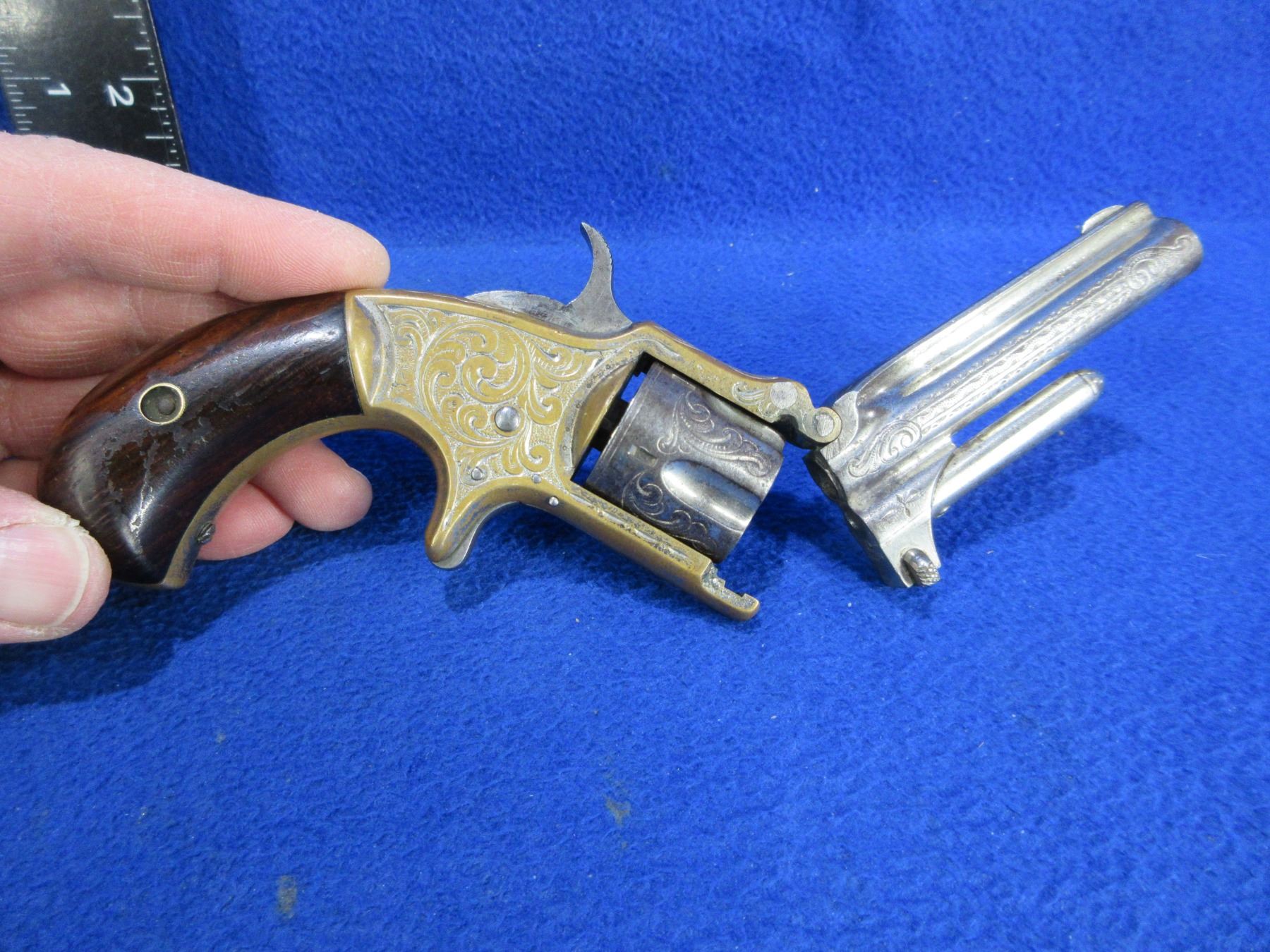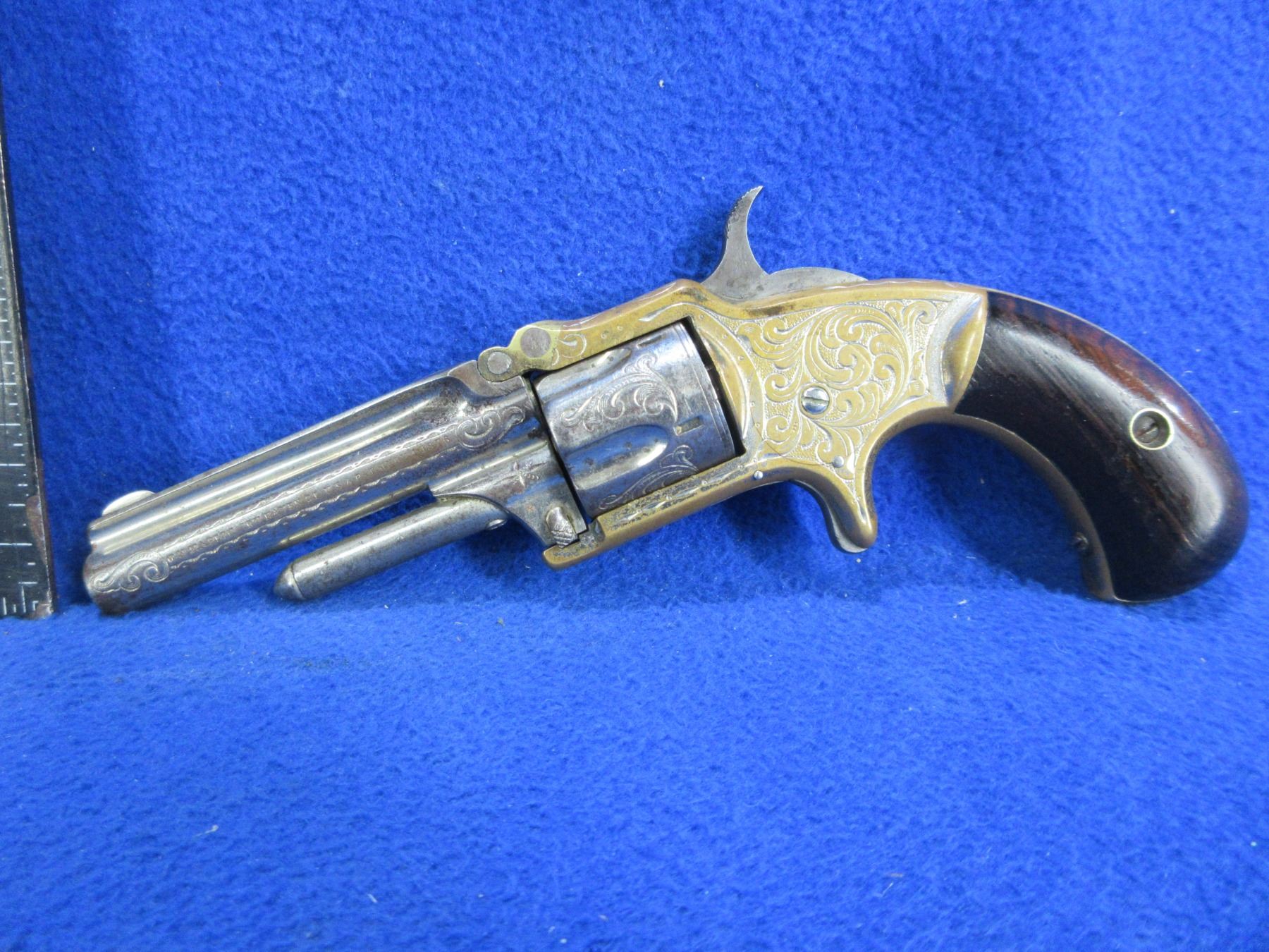Antique - No PAL Required - Marlin XXX Standard 1872 appears to be in 30 Rim Fire - Anyone can own this rare and nicely engraved antique, this five shot single action revolver appears to be in good working order. Barrel is 3". rifling is good for age with some light pitting, silver and gold finish is good but fading, has both sights, wood grip is good for age. Ser # 1733