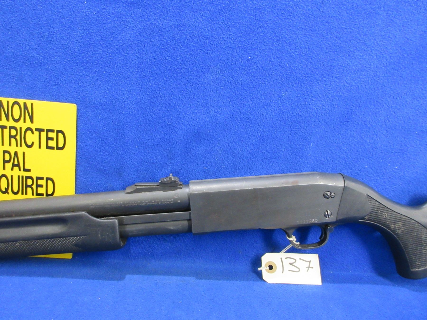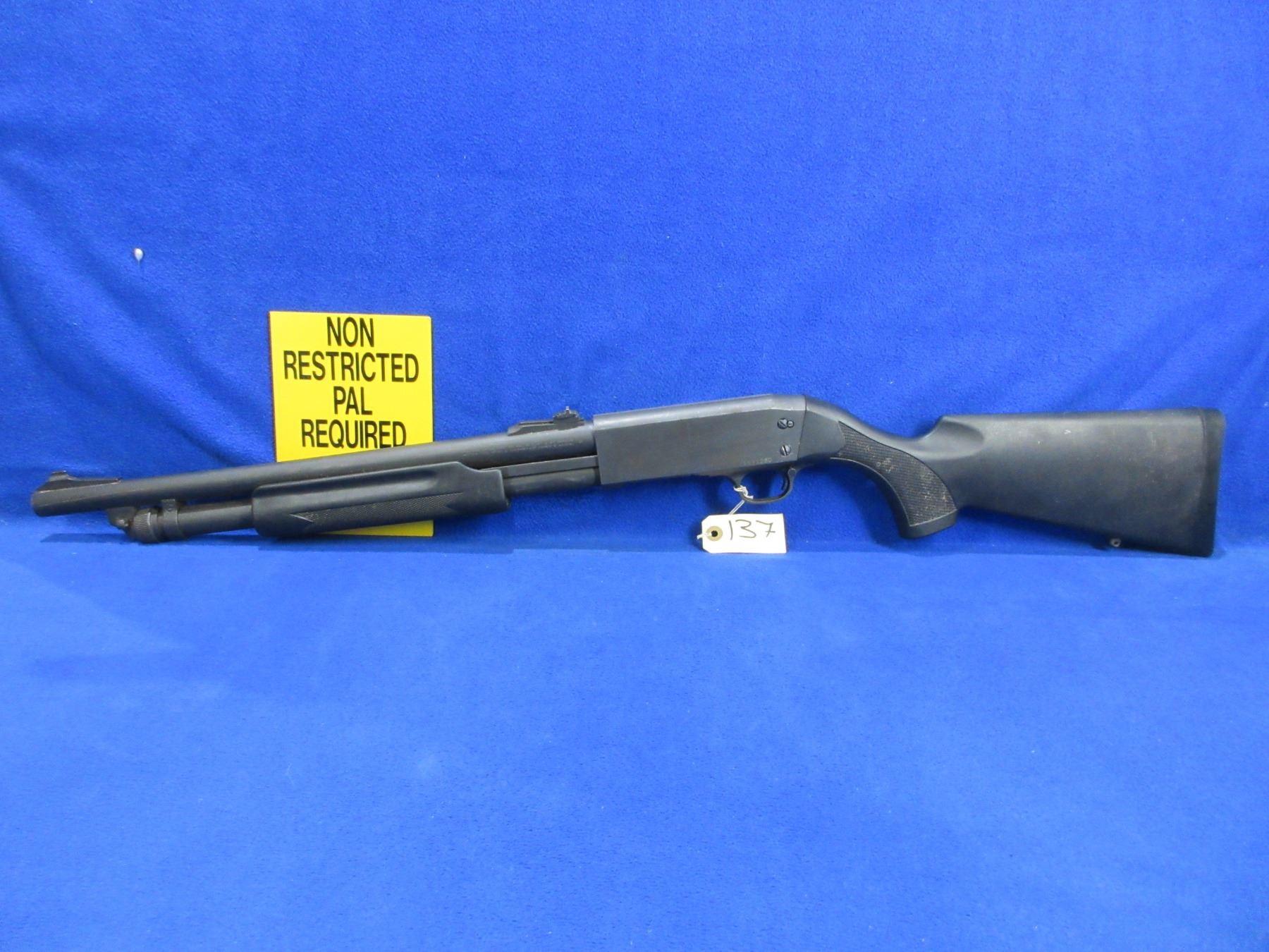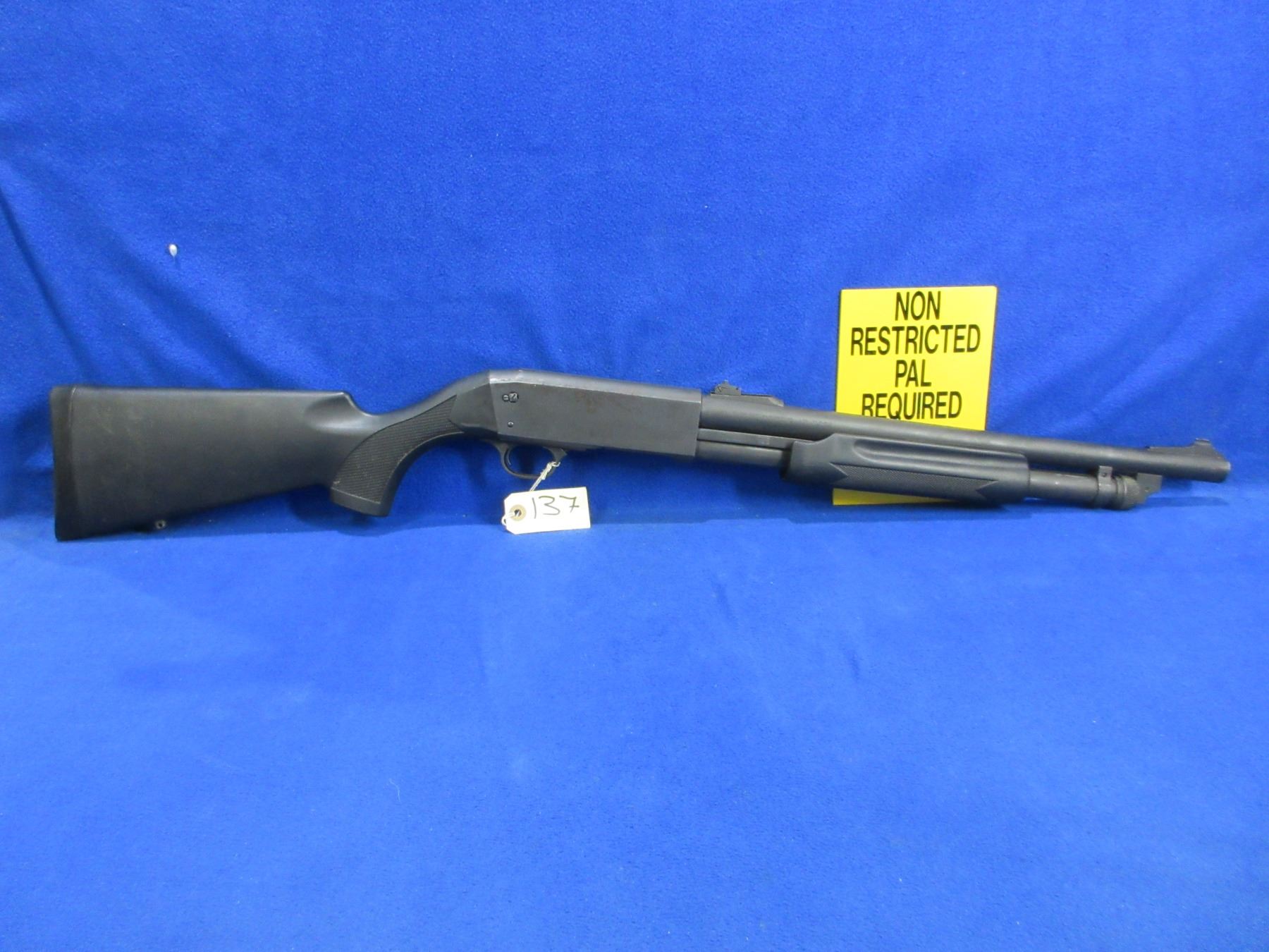 Non-Restricted - Stevens Model 350 in 12 Ga. 2 3/4", 3" - This pump action shotgun appears to be in good to very good working order. Barrel is 18", bore is good, black finish is fair to good with scratches and light pitting, has both sights, synthetic stock is good with usage marks, synthetic forearm is good with usage marks, rubber recoil pad good, comes with swivel studs. Ser # 111128D