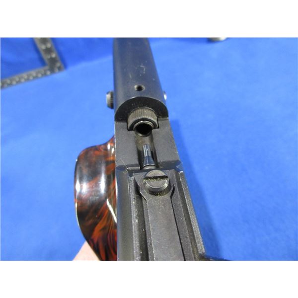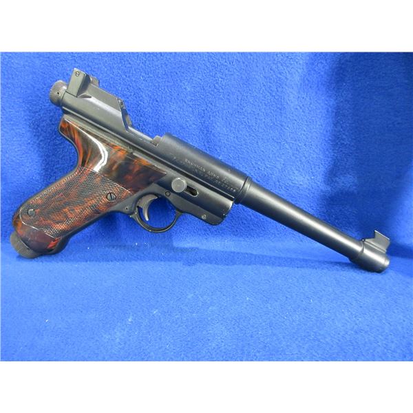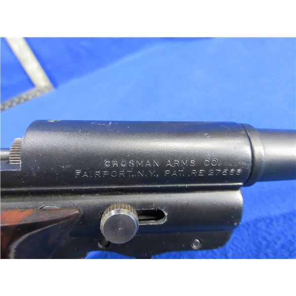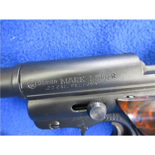 No PAL Required - Crossman Model Mark I Target in 22 Cal. - This single shot pellet CO2 air pistol appears to be in good working order. Barrel is 7 1/2", rifling is good to very good, bluing is good to very good, has both sights, right hand grips are good, comes with holster. Ser # None