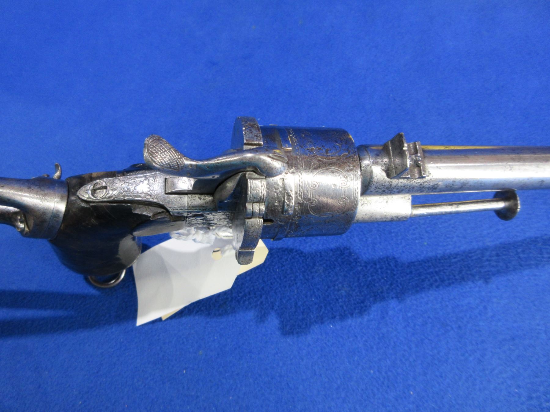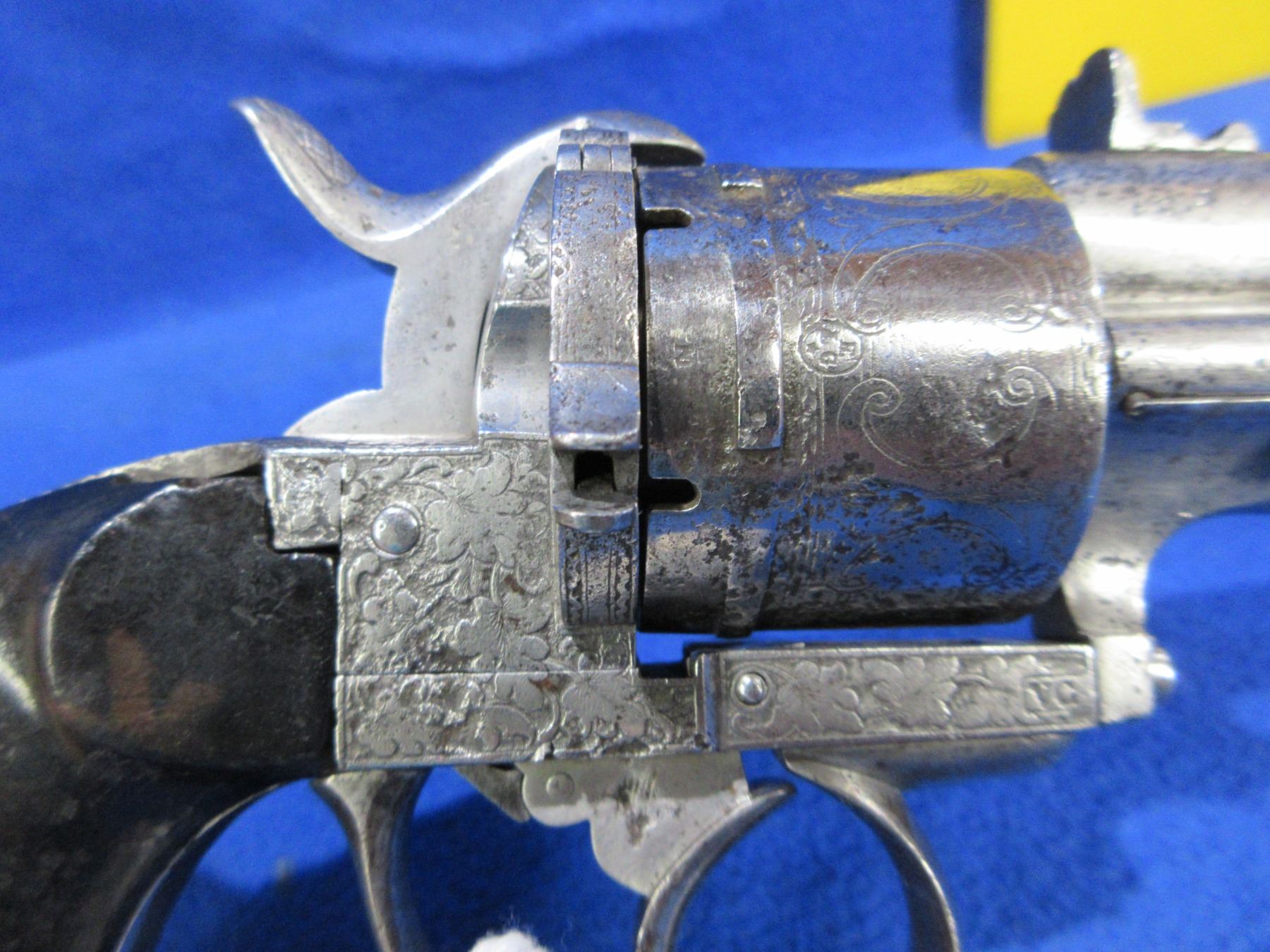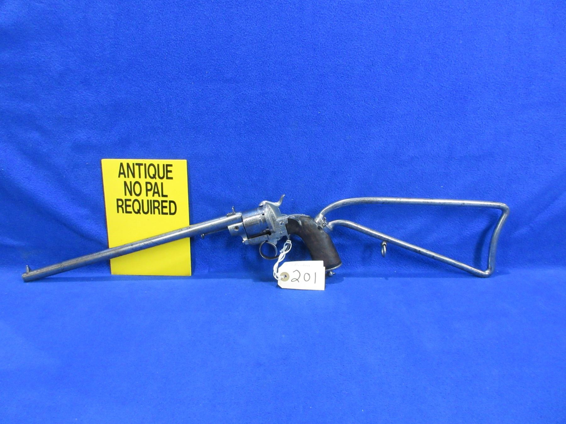Antique - No PAL Required - E. LeFauckeux Pinfire (appears to be in 11mm) Revolver - Anyone can own this nicely engraved antique revolver. This 6 shot double action revolver appears to be in working order. Barrel is 14", rifling is fair to good for age, silver finish has pitting, has both sights, wood grip has chips around the rear tang, comes with metal shoulder stock. Ser # None