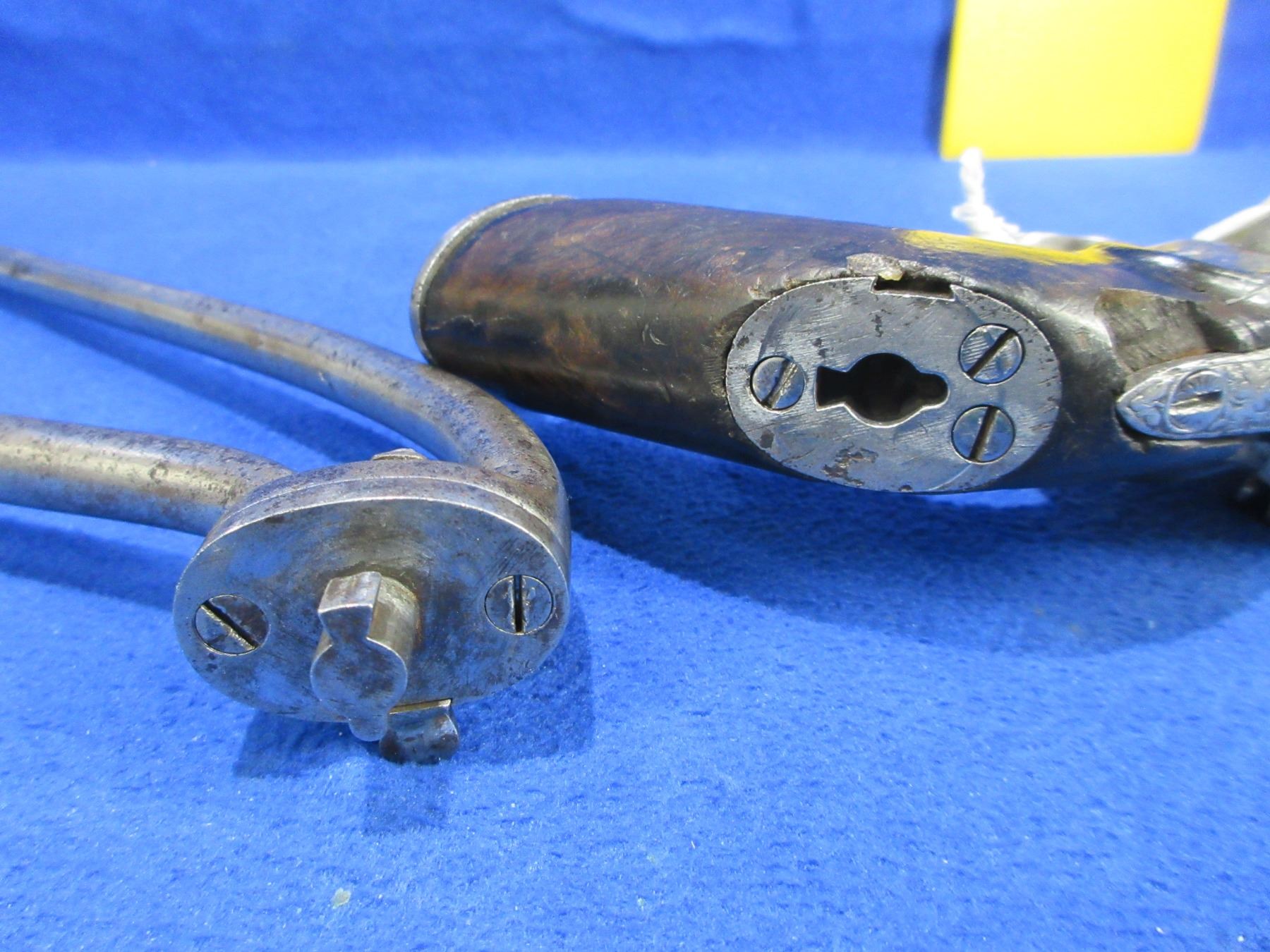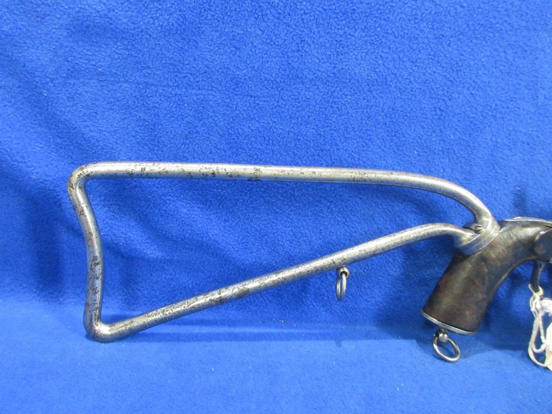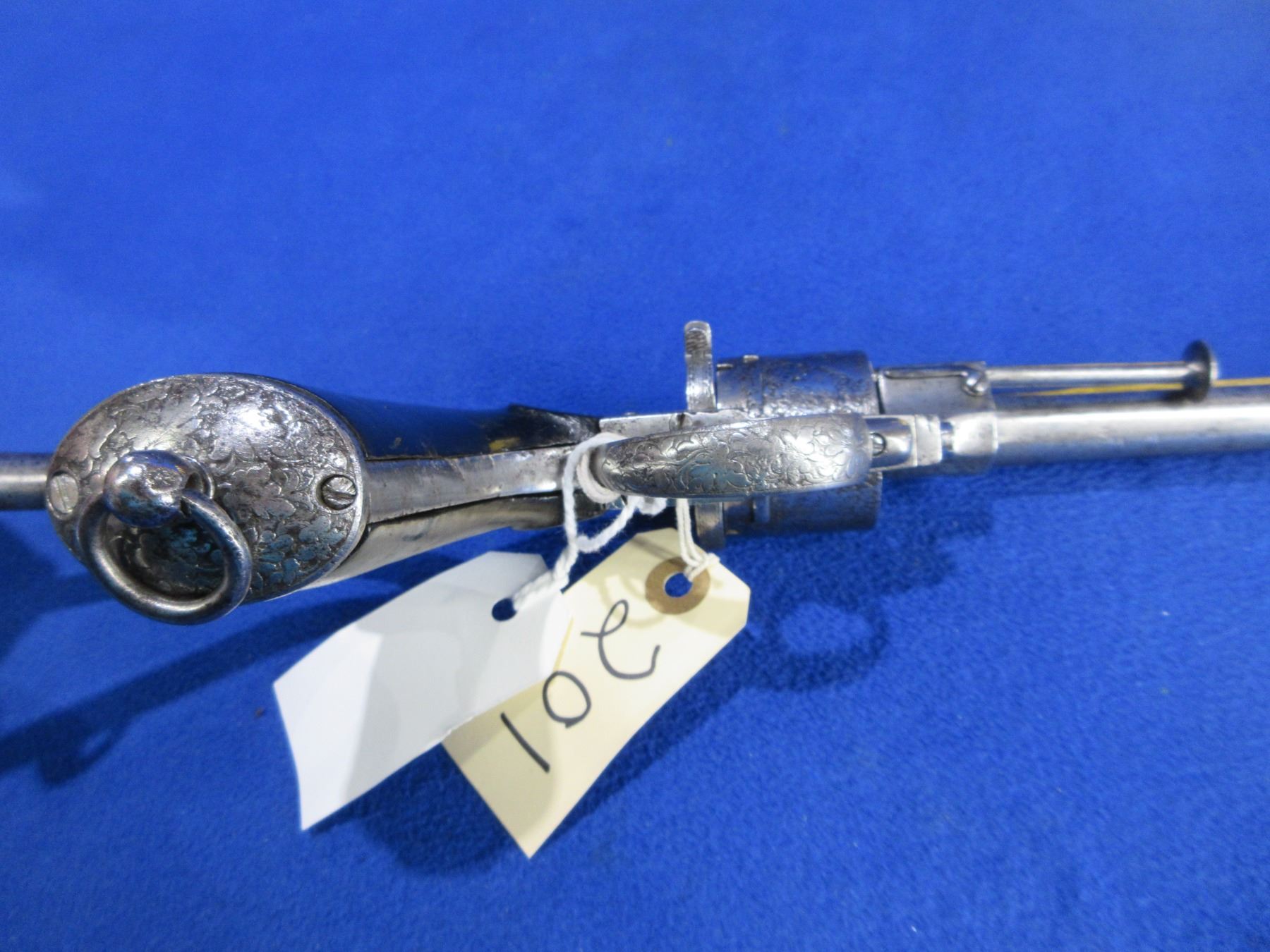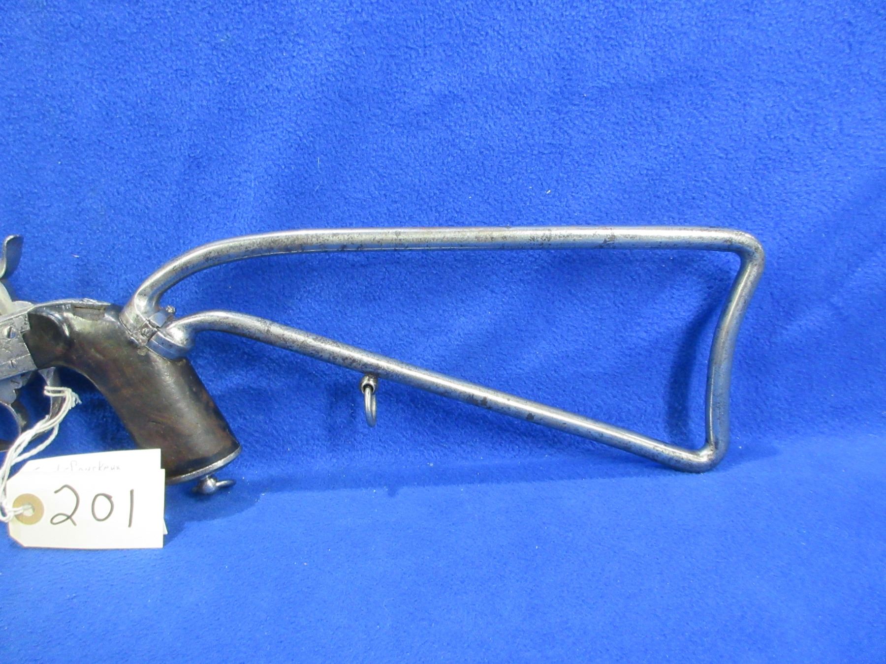 Antique - No PAL Required - E. LeFauckeux Pinfire (appears to be in 11mm) Revolver - Anyone can own this nicely engraved antique revolver. This 6 shot double action revolver appears to be in working order. Barrel is 14", rifling is fair to good for age, silver finish has pitting, has both sights, wood grip has chips around the rear tang, comes with metal shoulder stock. Ser # None