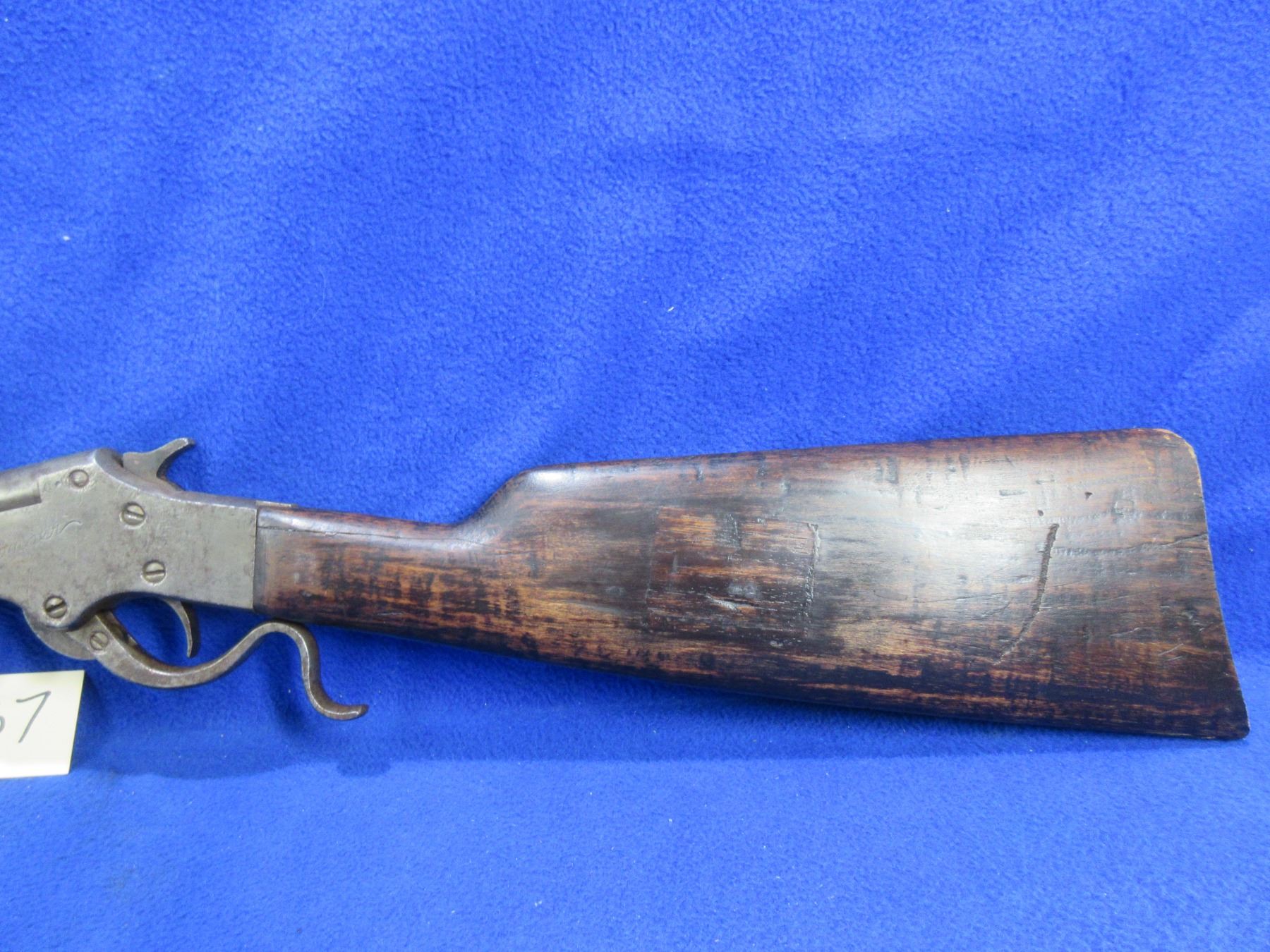 Non-Restricted - Ranger (Stevens Marksman Model 12) in 32 RF- This is a rare and desireable little gun. This single shot under lever tip up rifle appears to be in good working order, action is tight. Barrel is 20", rifling is fair to good, bluing is poor and grey, has both sights, stock is cracked in the wrist area, forearm is fair to good, butt plate missing. Ser # H379