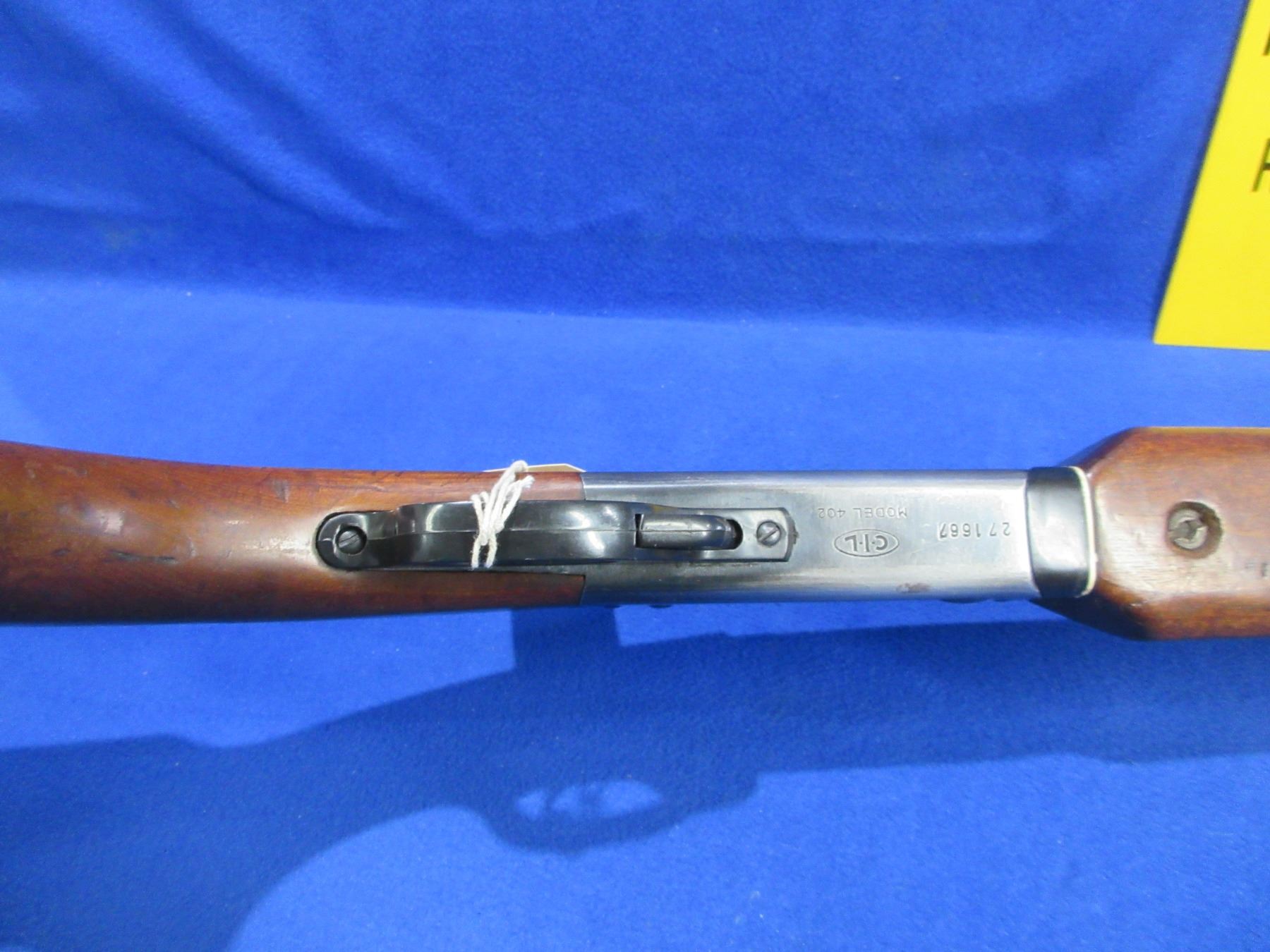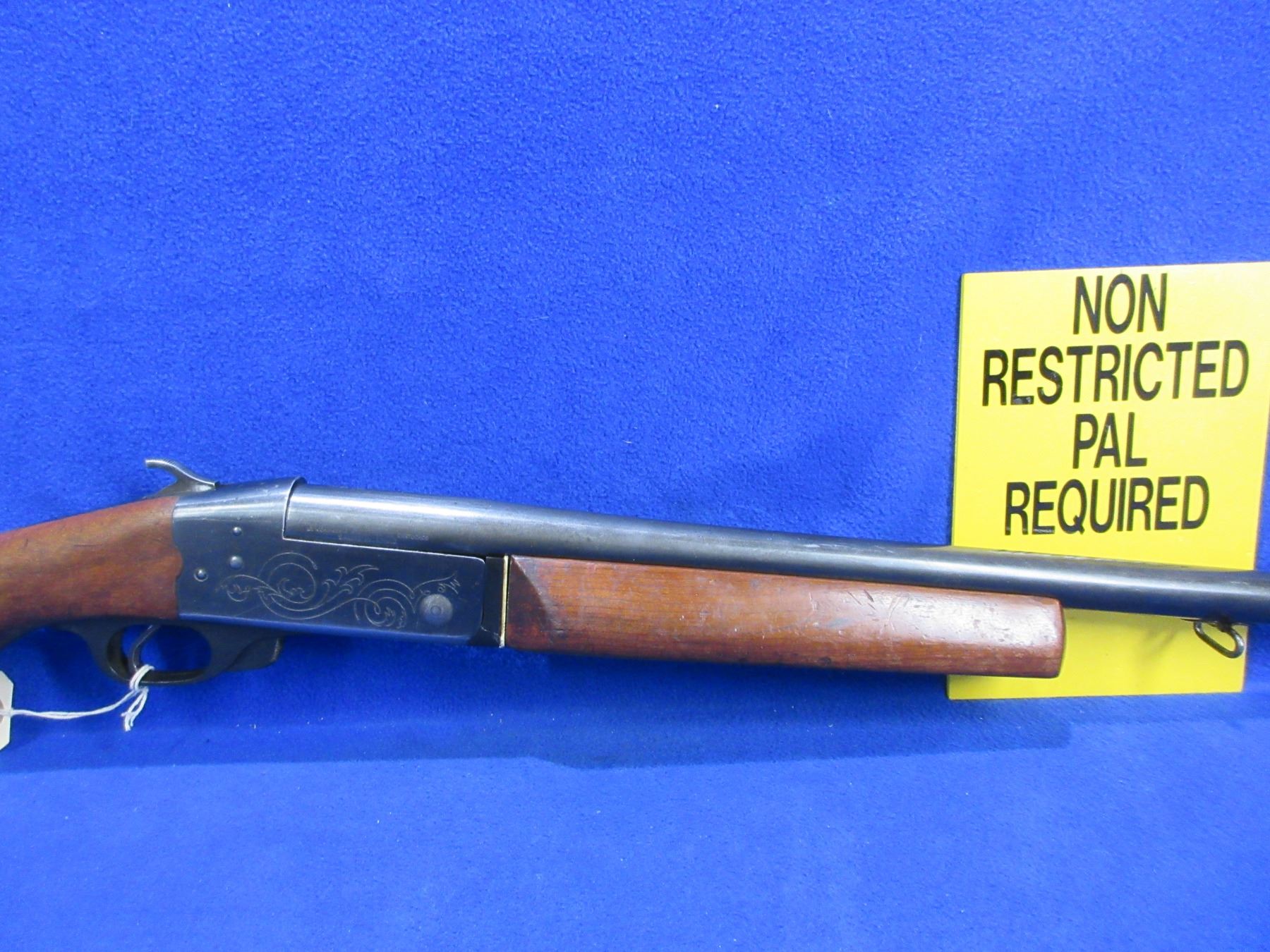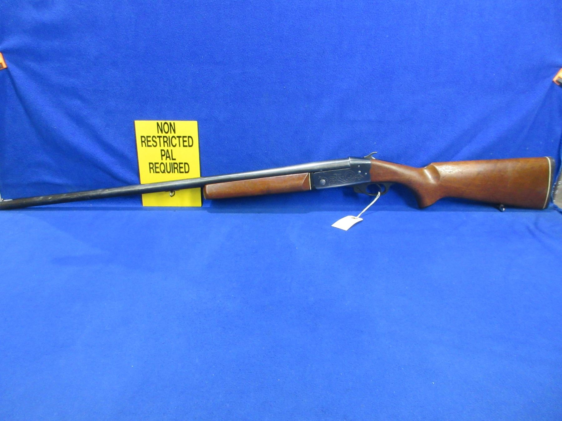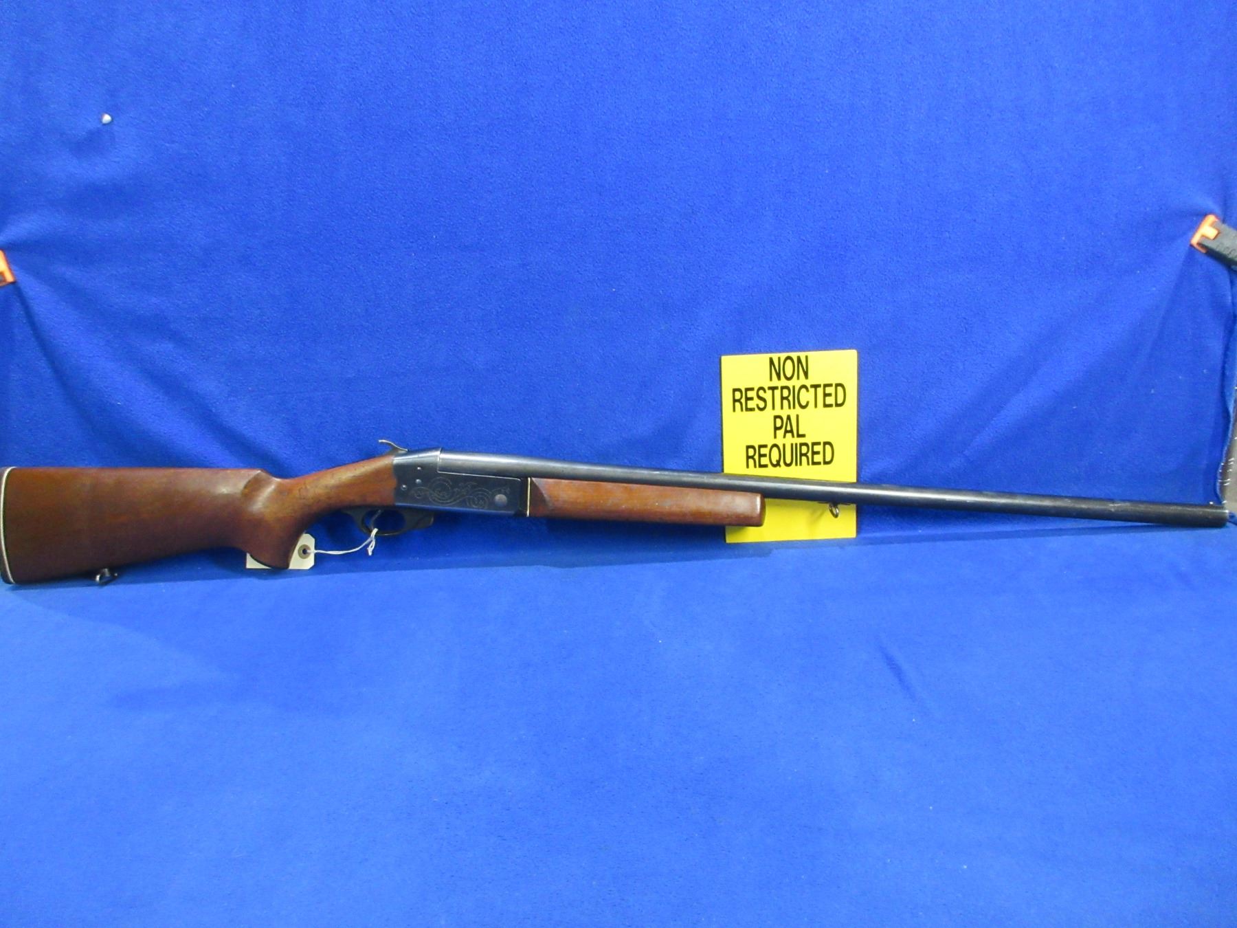 Non-Restricted - CIL Model 402 in 12 Ga. 2 3/4" Full - This tip up single shot shotgun appears to be in good to very good working order, action is tight. Barrel is 30", bore is good to very good, bluing is turning grey, has bead front sight, stock is good with usage marks, forearm is good with usage marks but spacer has a crack repair, butt plate good, comes with swivels. Ser # 271667