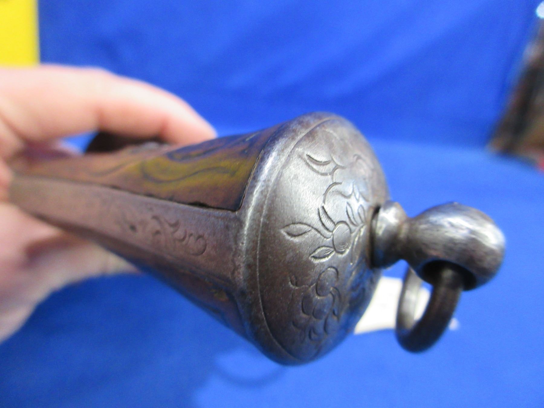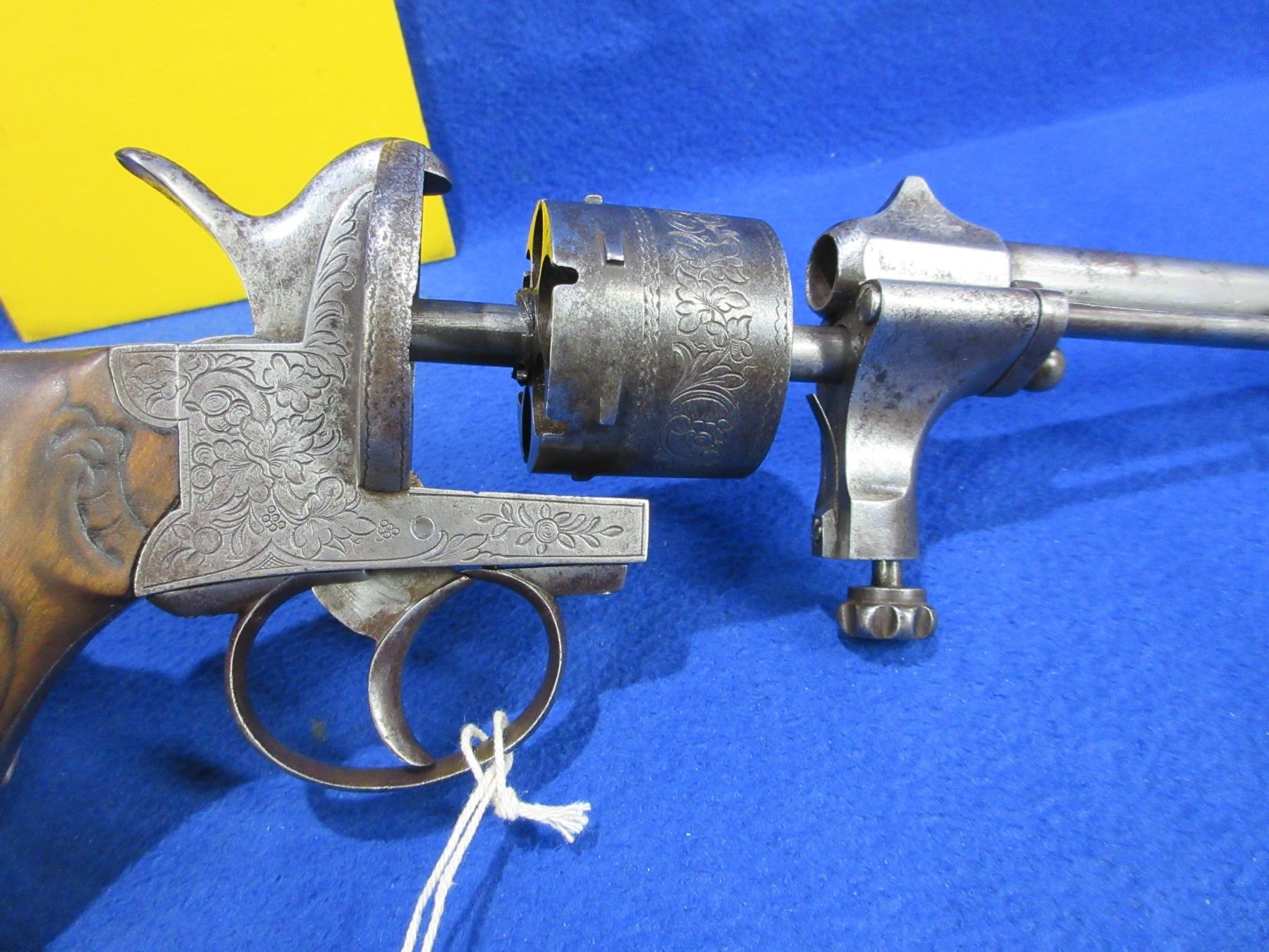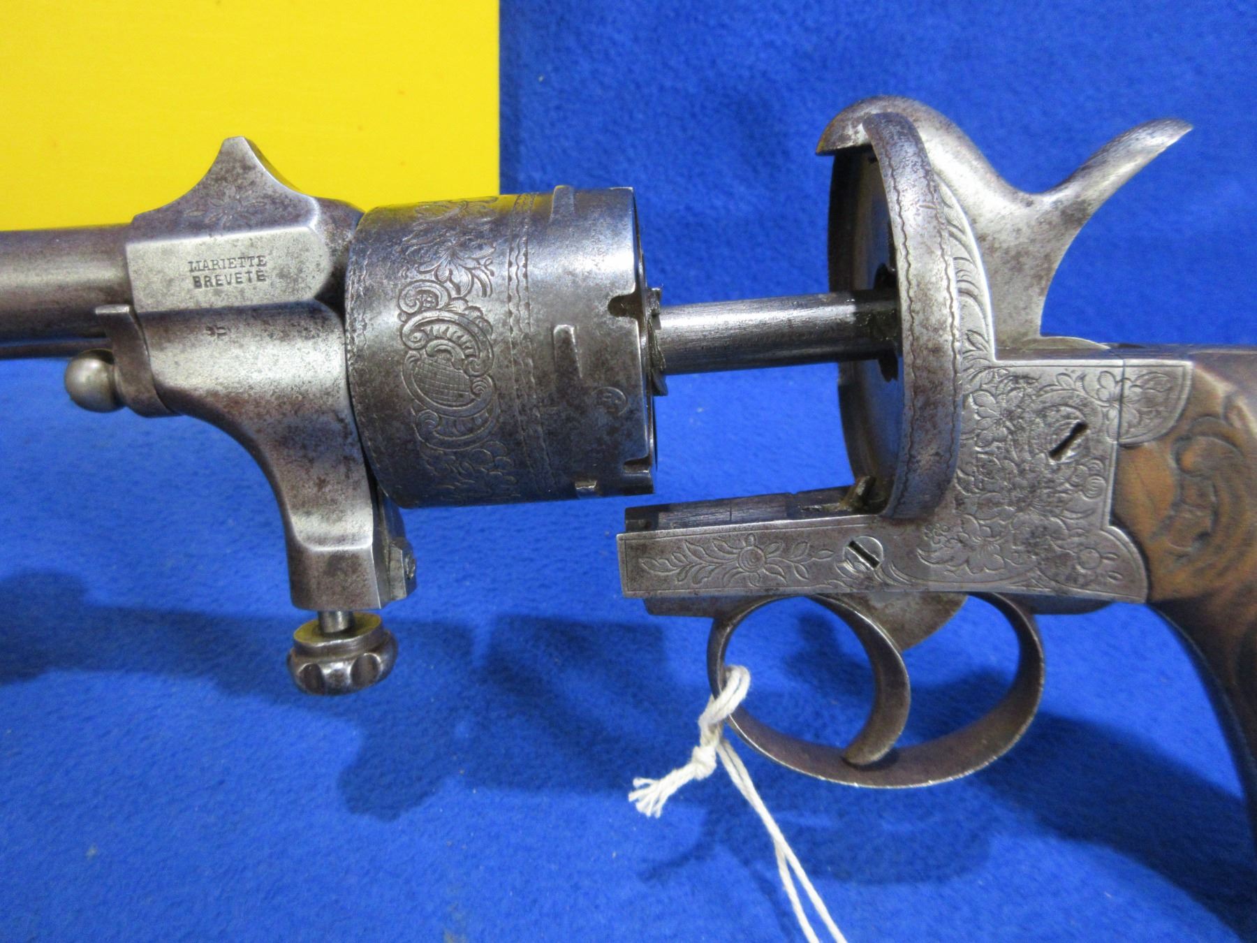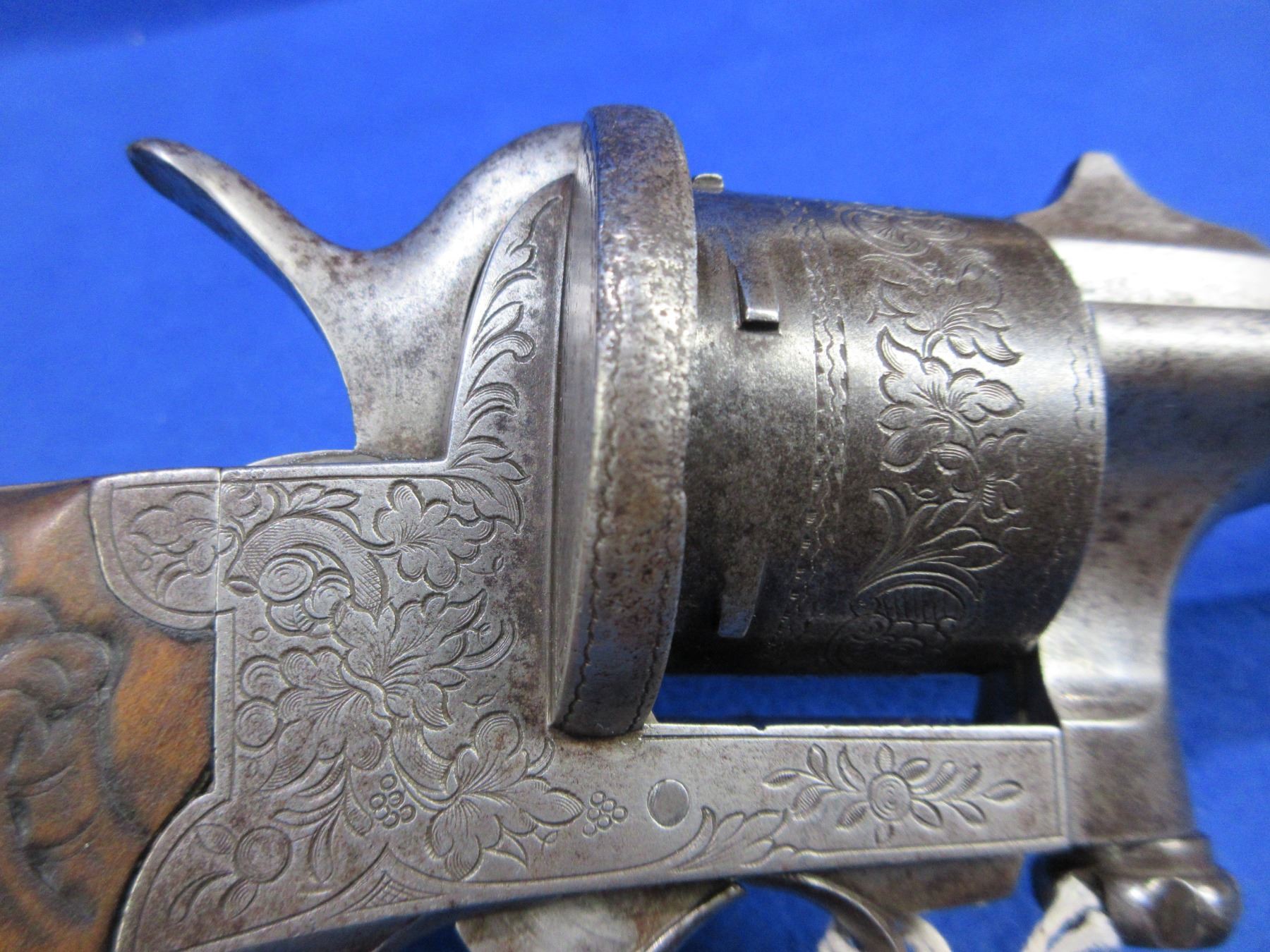 Antique - No PAL Required - Mariette Brevete Sliding Lock Pinfire Revolver in 11mm - Anyone can own this rare, fine engraved antique six shot double action revolver appears to be in good working order. Barrel is 6". Rifling is good for age, bluing is gone and has light pitting, has both sights, wood grips are good for age, comes with lanyard loop on butt. Ser # 13