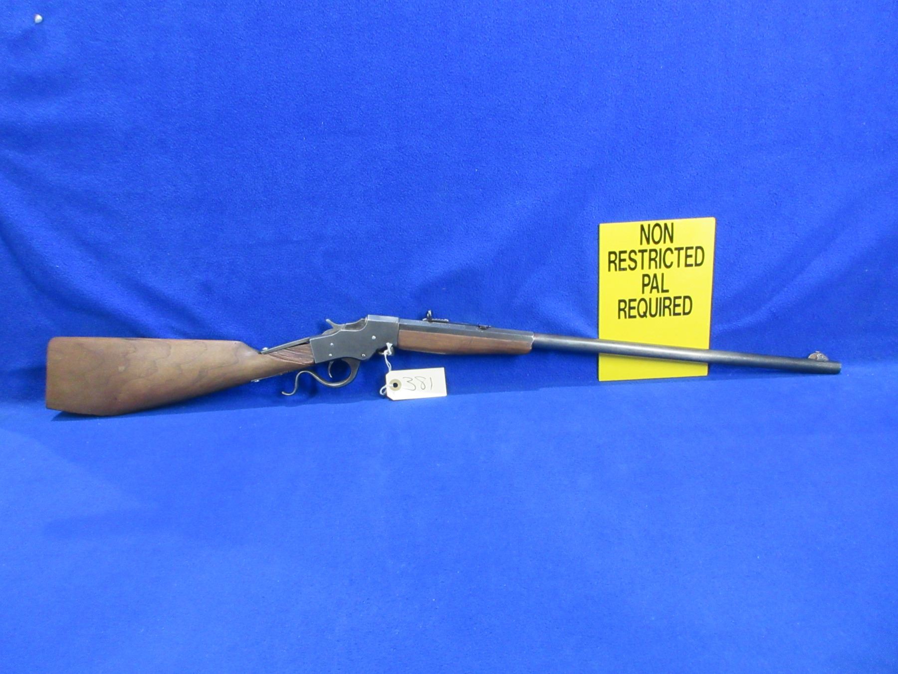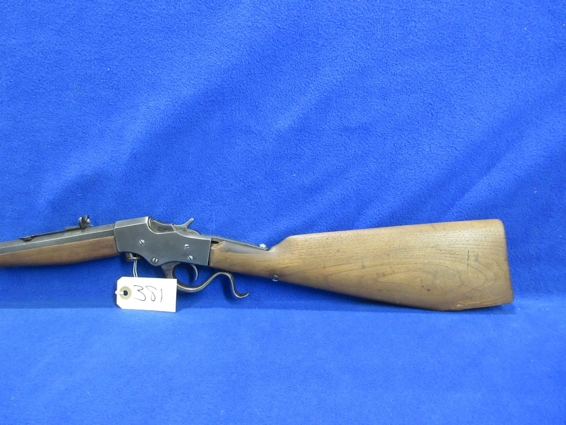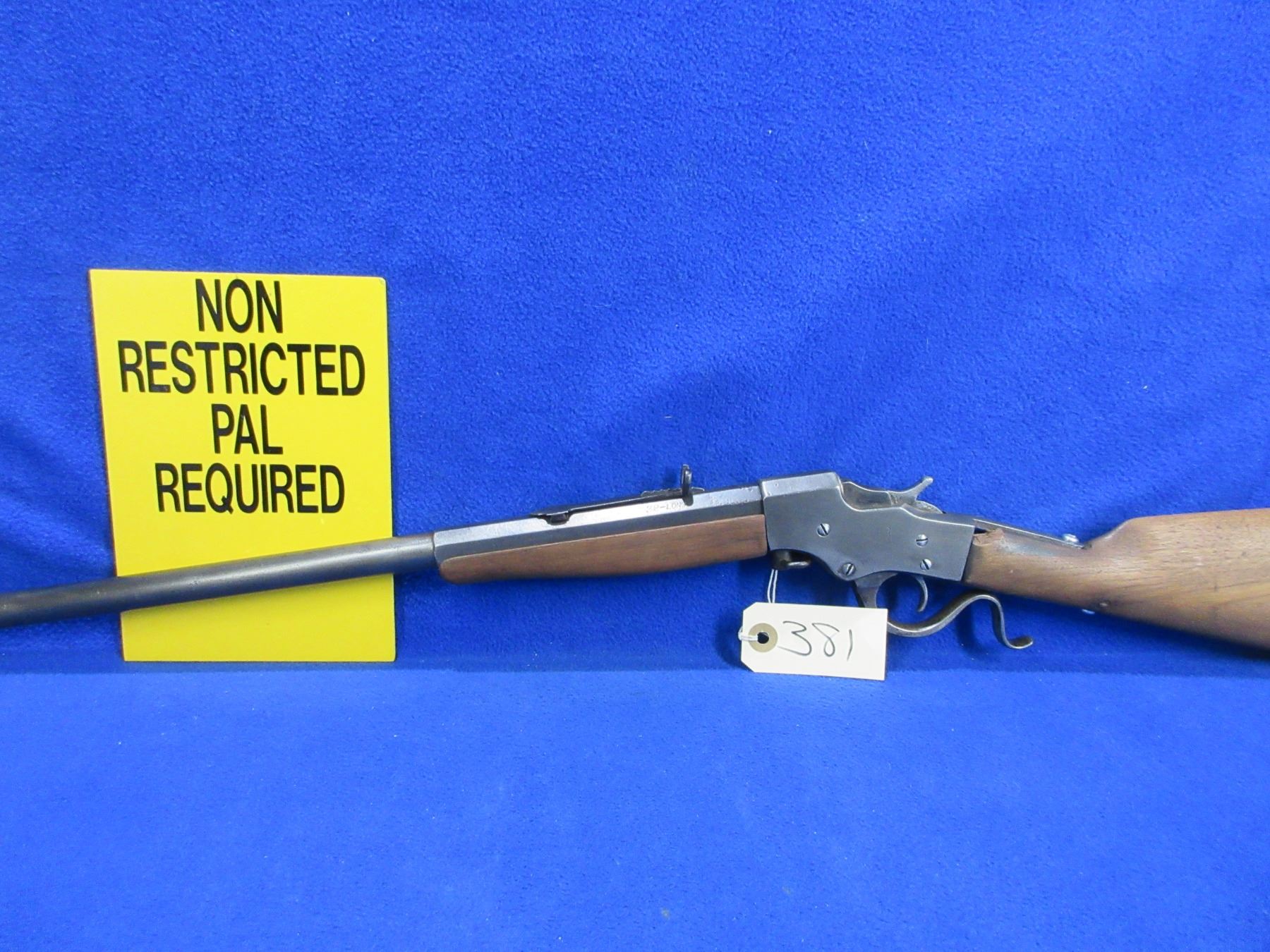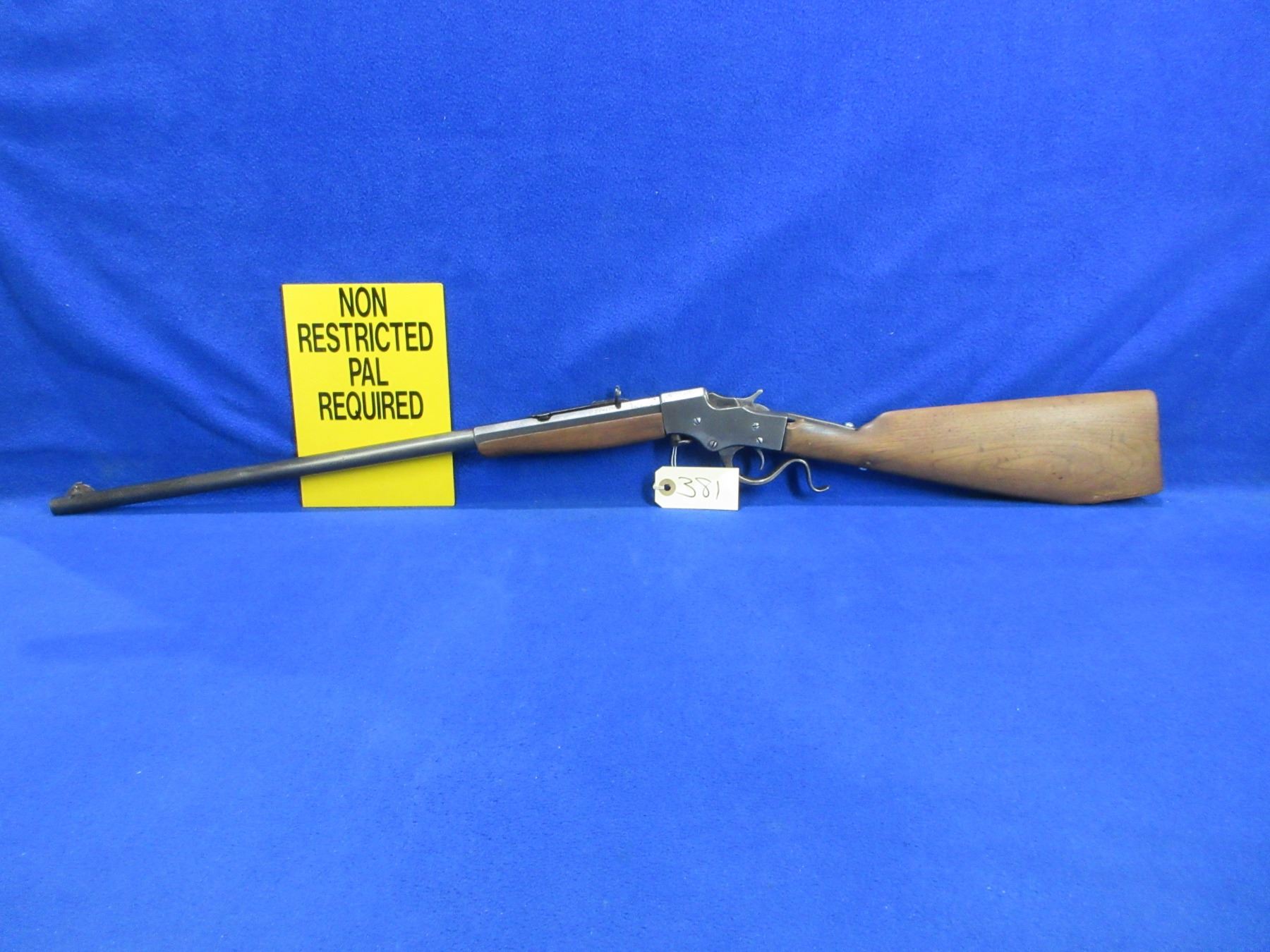 Non-Restricted - J. Stevens Model Favorite in 32 Long RF - This single shot falling block rifle appears to be in good working order but should not be fired as stock is broken. Barrel is 24", rifling is poor to fair, bluing is turning grey and barrel has some pitting, rear sight ramp is not attached and semi buckhorn rear sight has incorrect screw, front sight is incorrect/modified, stock is broken at the wrist, has a large chip at the toe and has incorrect screws in both rear tangs, forearm has a small crack at front on right, butt plate missing. Ser # P447