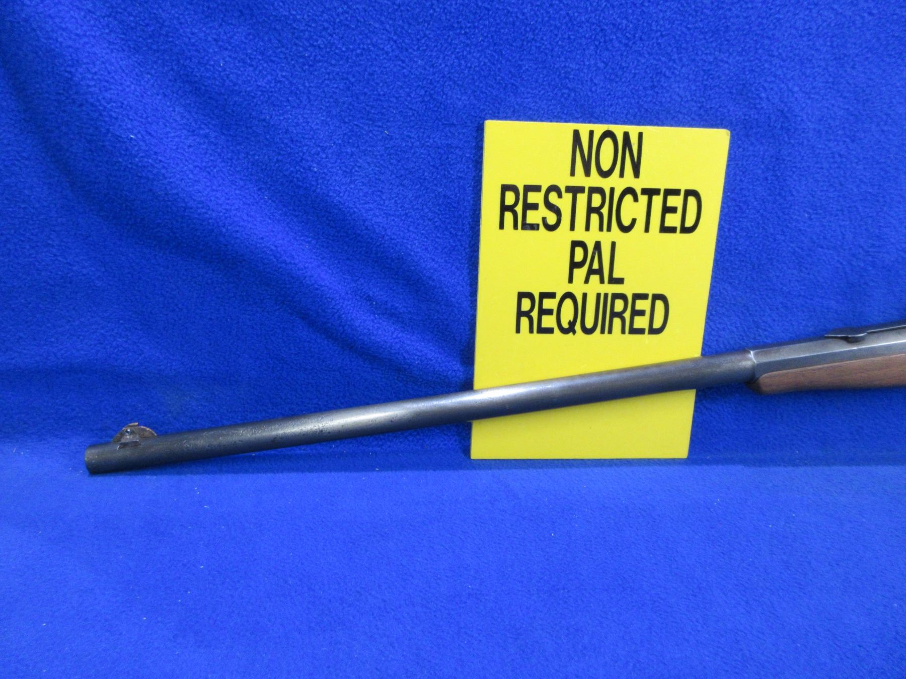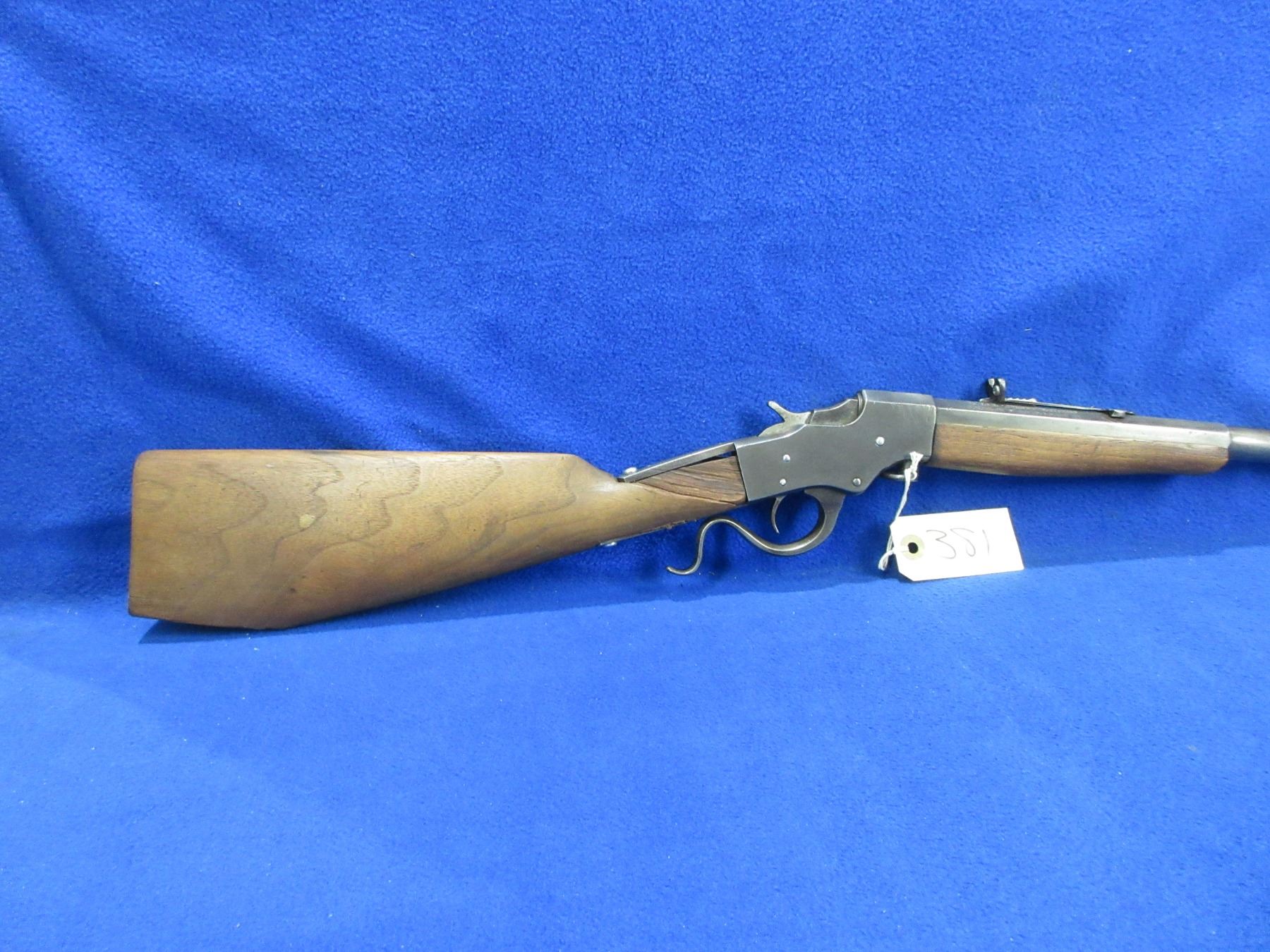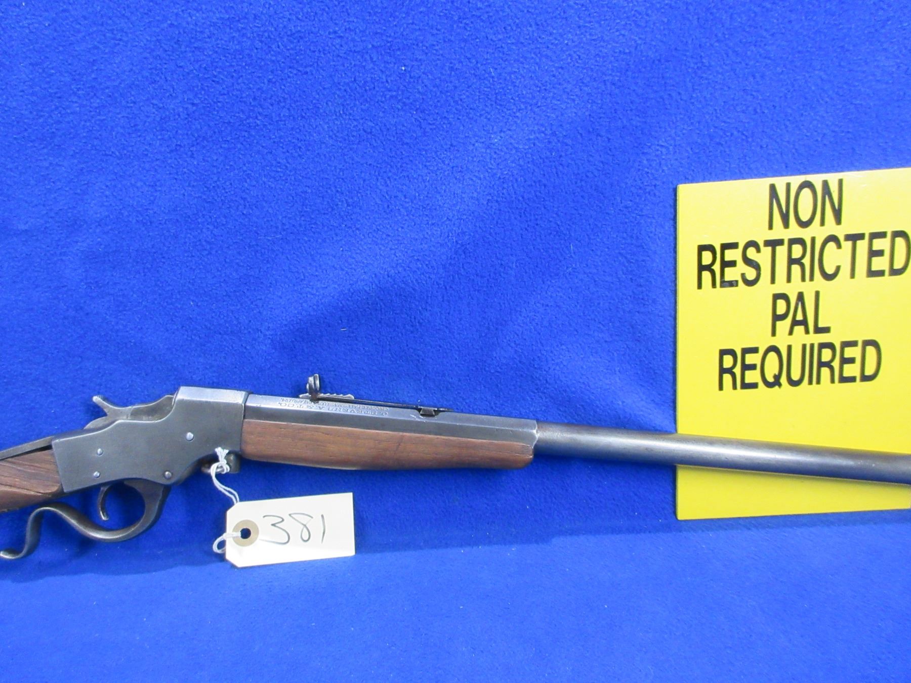 Non-Restricted - J. Stevens Model Favorite in 32 Long RF - This single shot falling block rifle appears to be in good working order but should not be fired as stock is broken. Barrel is 24", rifling is poor to fair, bluing is turning grey and barrel has some pitting, rear sight ramp is not attached and semi buckhorn rear sight has incorrect screw, front sight is incorrect/modified, stock is broken at the wrist, has a large chip at the toe and has incorrect screws in both rear tangs, forearm has a small crack at front on right, butt plate missing. Ser # P447