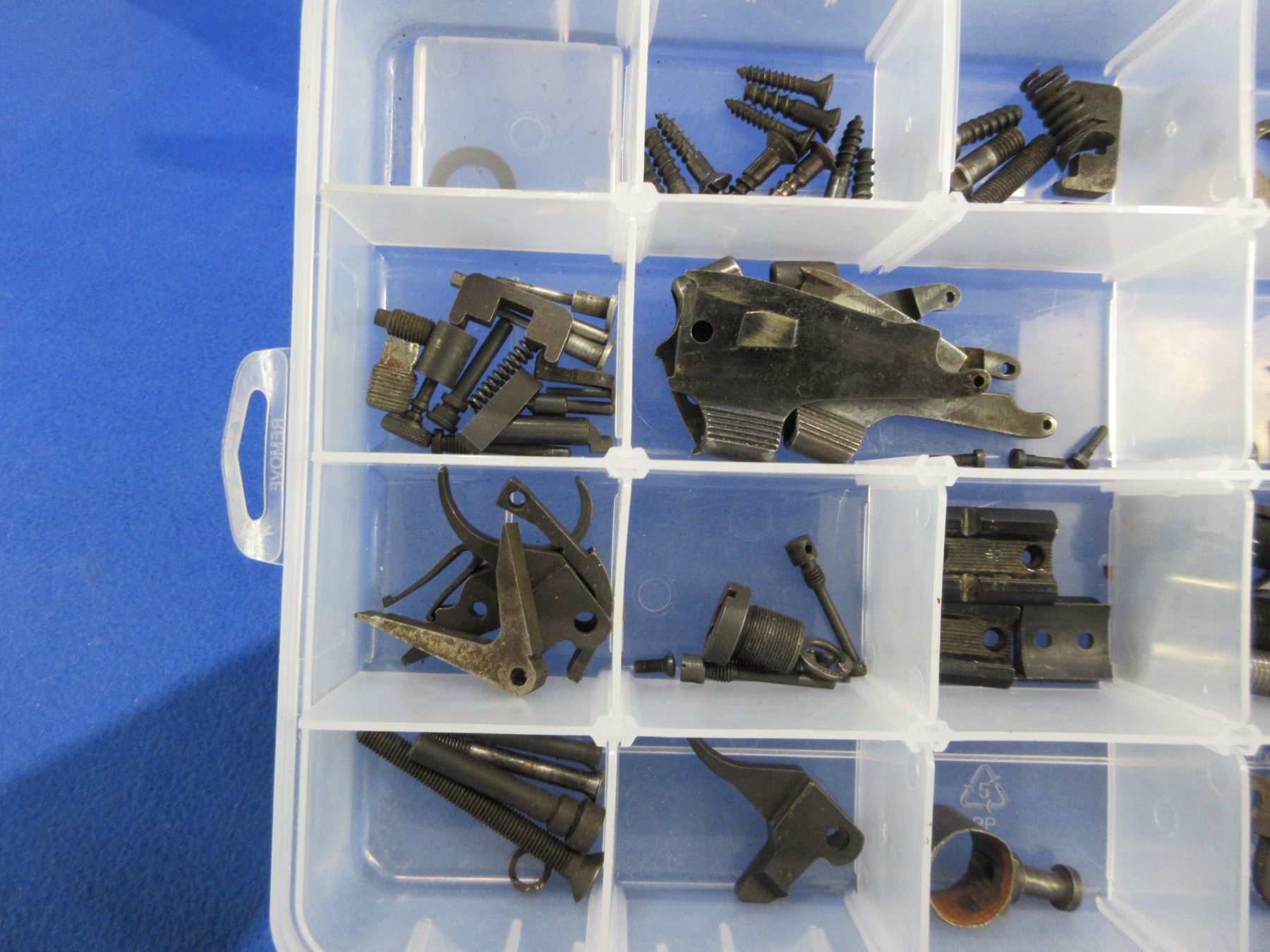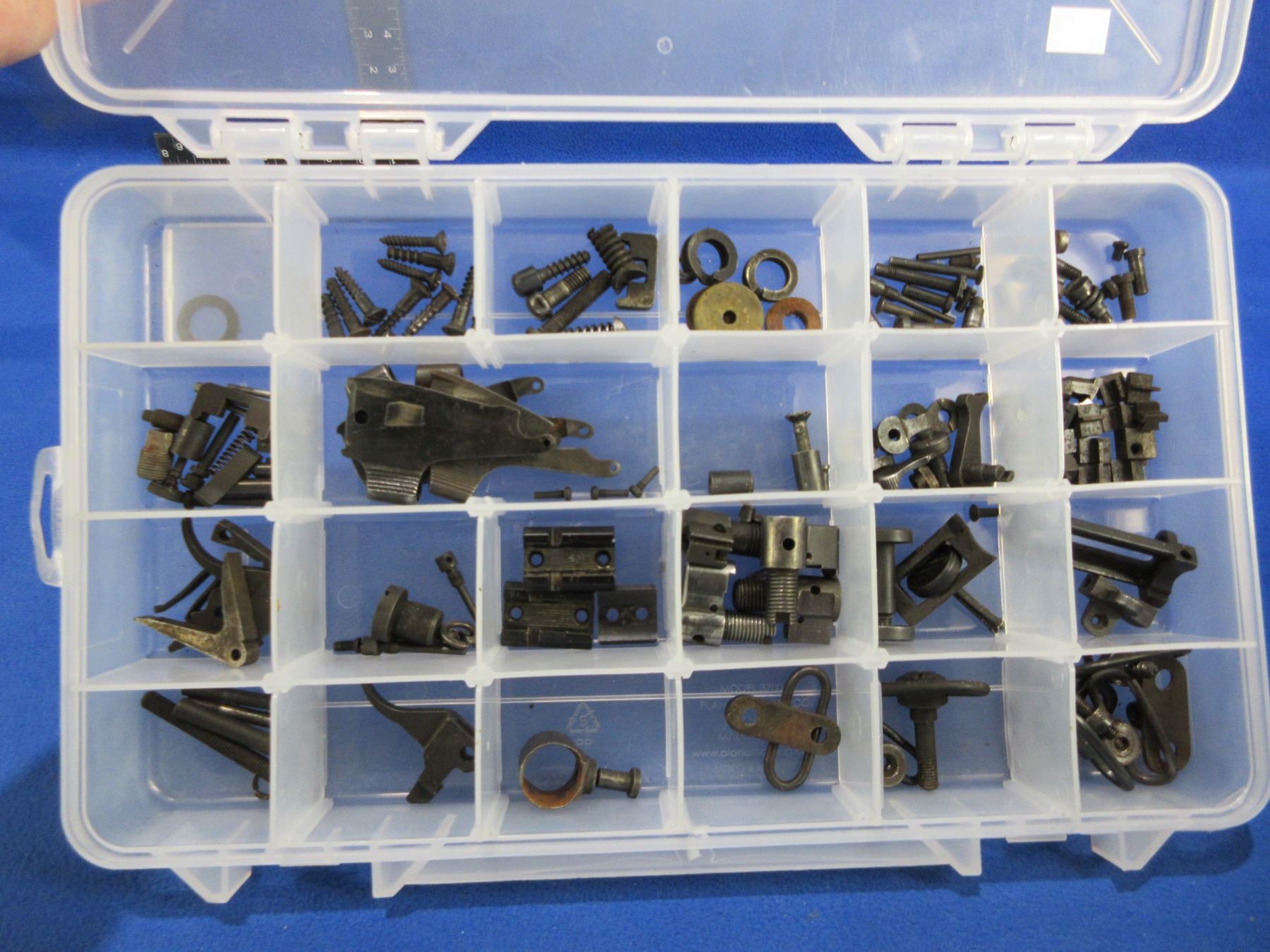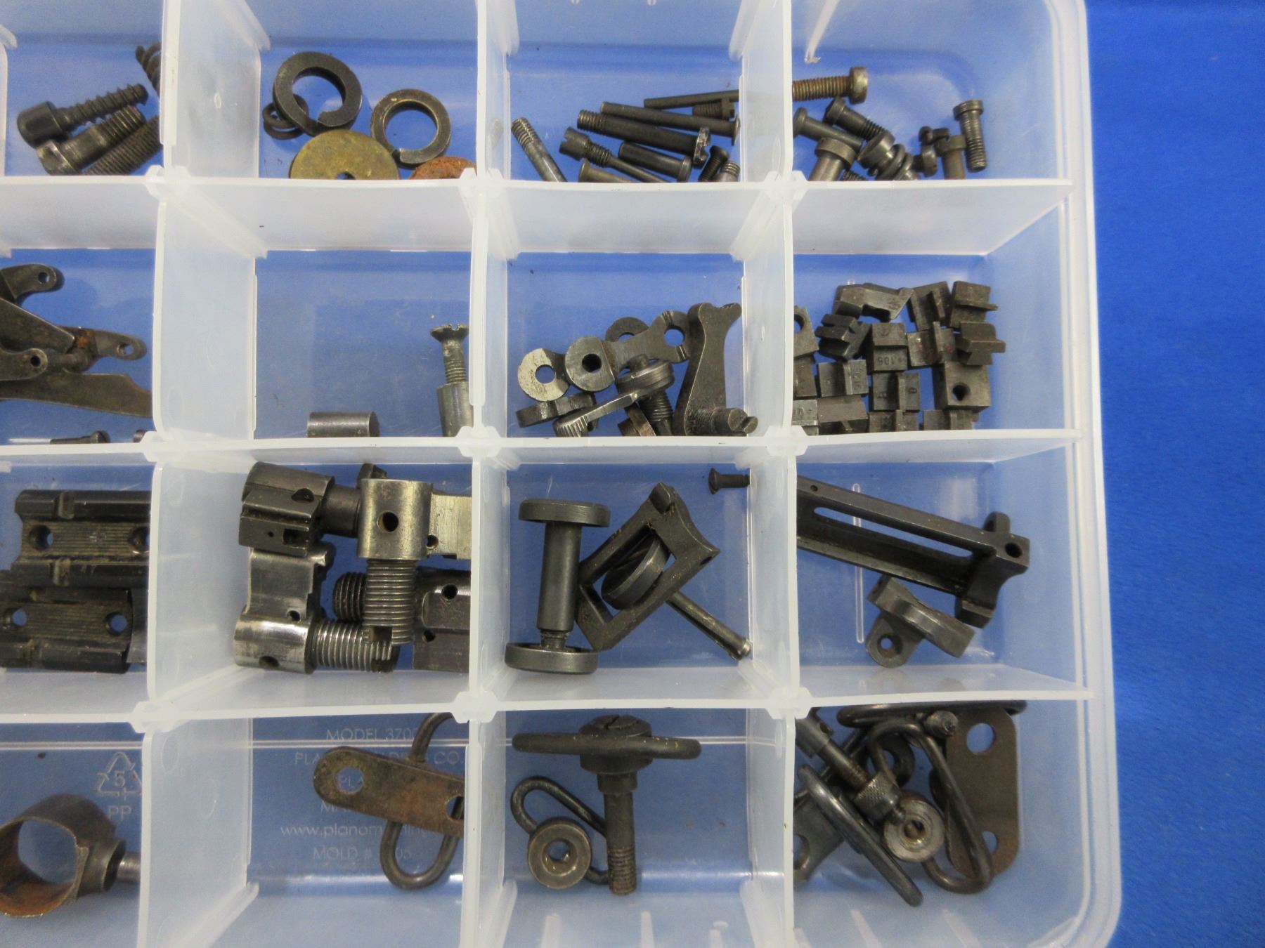 Lot of Misc. Gun Parts - Swivels, Bases, Screws, Sights, Triggers, Etc. - In Plano Prolatch Stowaway 4-24 Adjustable Compartment Case
